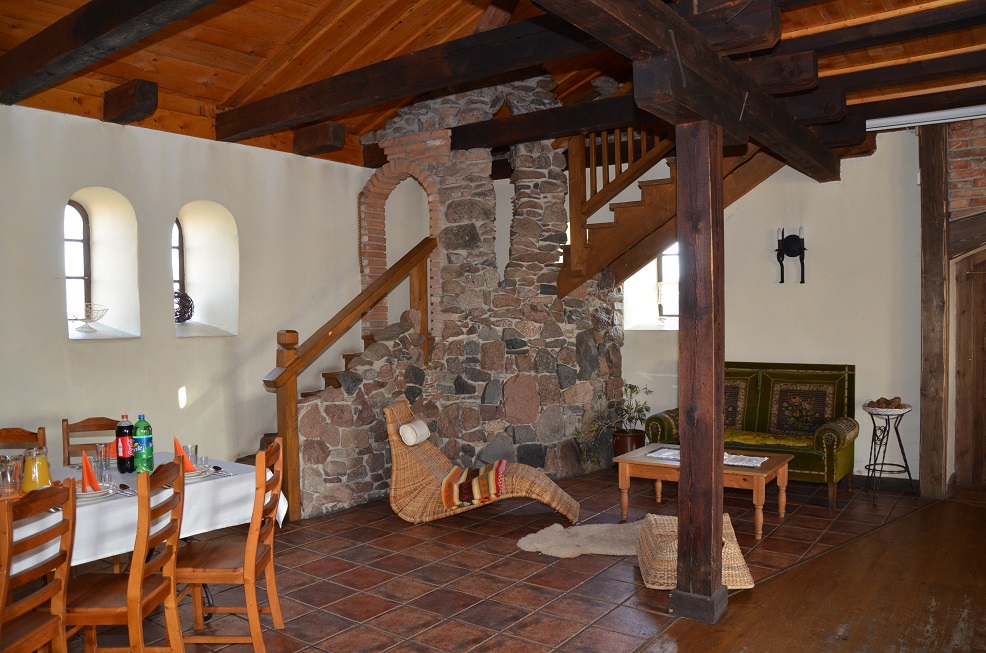 Dwa wejścia na górny poziom (pokoje gościnne, baszta, tarasy).