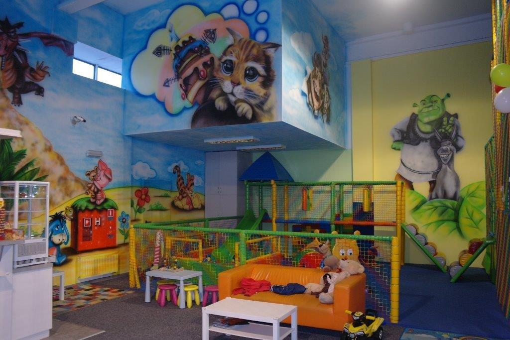Kawiarnia na piętrze dla rodziców z tv i klimatyzacją oraz stolikami i kanapą