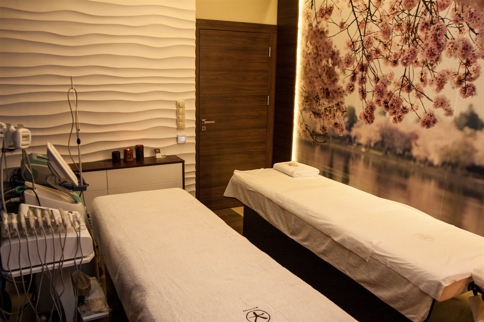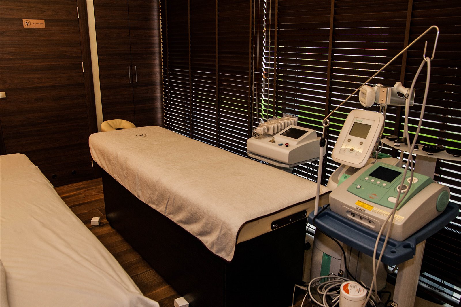 Gabinety do zabiegów na twarz i ciało z elektrycznie sterowanymi, podgrzewanymi fotelami, wyposażone w 18 profesjonalnych, najnowocześniejszych maszyn i urządzeń kosmetycznych.