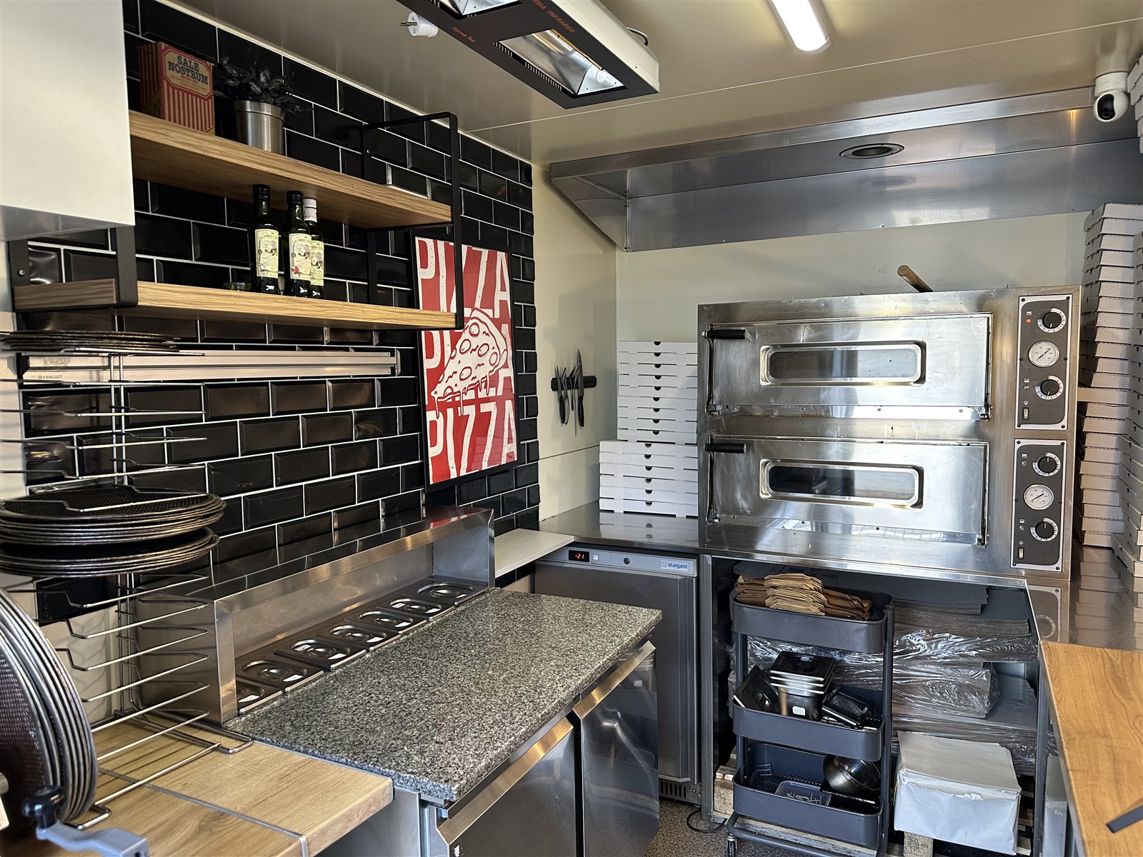 W skład wyposażenia przyczepy wchodzą: meble kuchenne w zabudowie, zlewozmywak 3-komorowy, system wentylacji z profesjonalnym wyciągiem, szafa mroźnicza, chłodziarko - zamrażarka, chłodziarka, dwukomorowy piec do pizzy, stół chłodniczy do pizzy, wałkownica do ciasta, ekspres do kawy i herbaty, stoliki i krzesła dla klientów oraz wszystkie narzędzia potrzebne do produkcji pizzy itp.