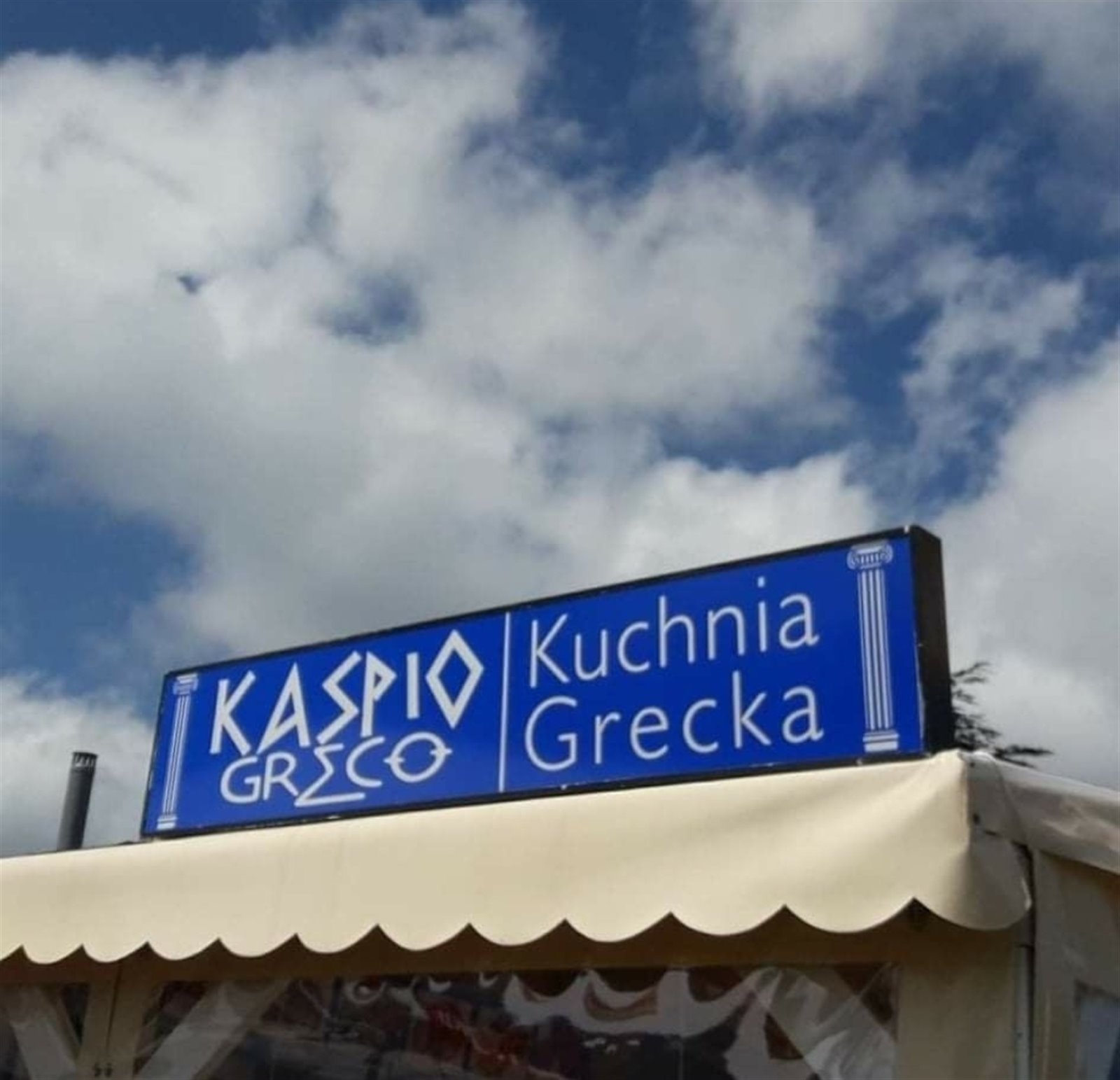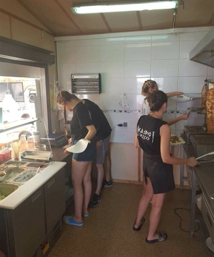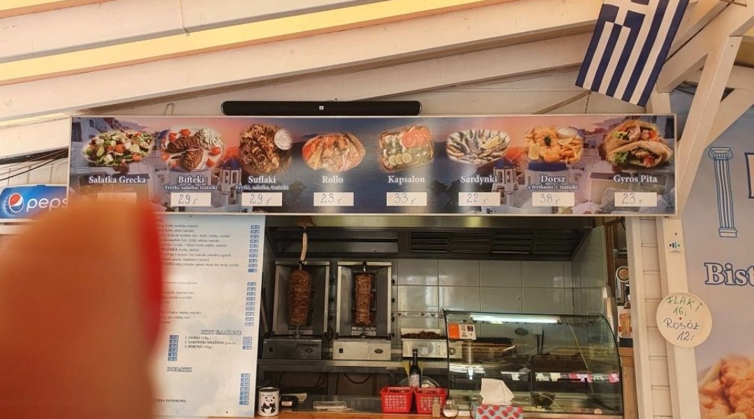 Potrawy takie jak gyros, bifteki, suflaki, tzatziki, ryby, burgery, fischburgery, sałatki greckie, napoje oraz piwo.