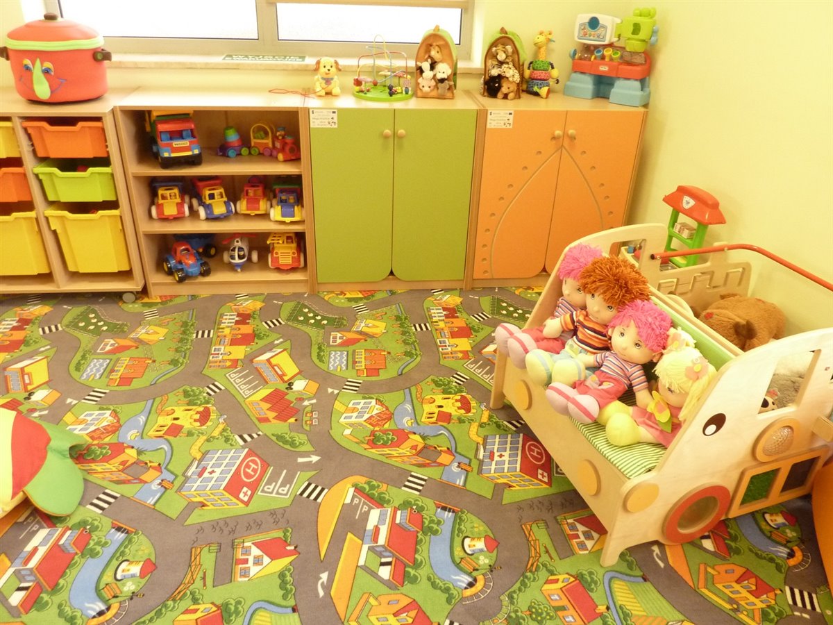 Żłobek to dwie, w pełni wyposażone sale, szatnia dla dzieci, pokój socjalny dla opiekunów, dwie łazienki, kuchnia i plac zabaw. Każde pomieszczenie wypełnione jest meblami i sprzętem przystosowanym do sprawowania określonych funkcji np. w salach są regały, szafy, łóżeczka z pościelą, stoliki, krzesełka dla dzieci w wieku 1-3lata a np. w kuchni sprzęt AGD. Większość wyposażenia może być wykorzystywana przy opiece nad dziećmi młodszymi do 1 roku jak i starszymi np. w wieku przedszkolnym. W żłobku znajduje się bardzo dużo zabawek posiadających wszystkie wymagane atesty czy certyfikaty, przeznaczonych zarówno dla dziewczynek jak i chłopców. Dodatkowo do żłobka należy bogate, atestowane wyposażenie placu zabaw.
