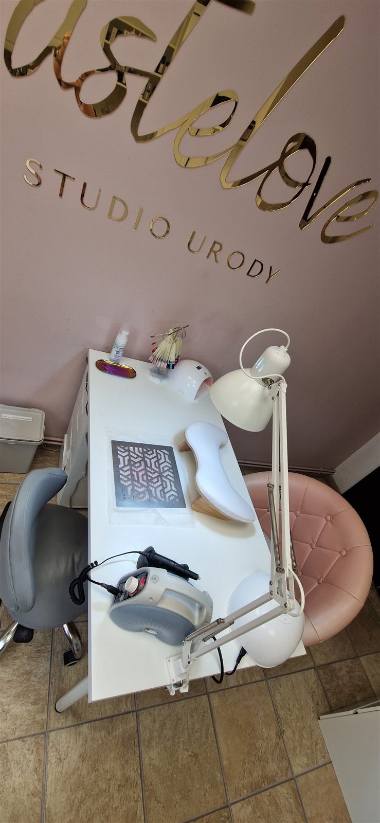-stanowisko do stylizacji paznokci z wbudowanym pochłaniaczem pyłu Ulka Premium (na gwarancji) oraz dwoma lampami UV,