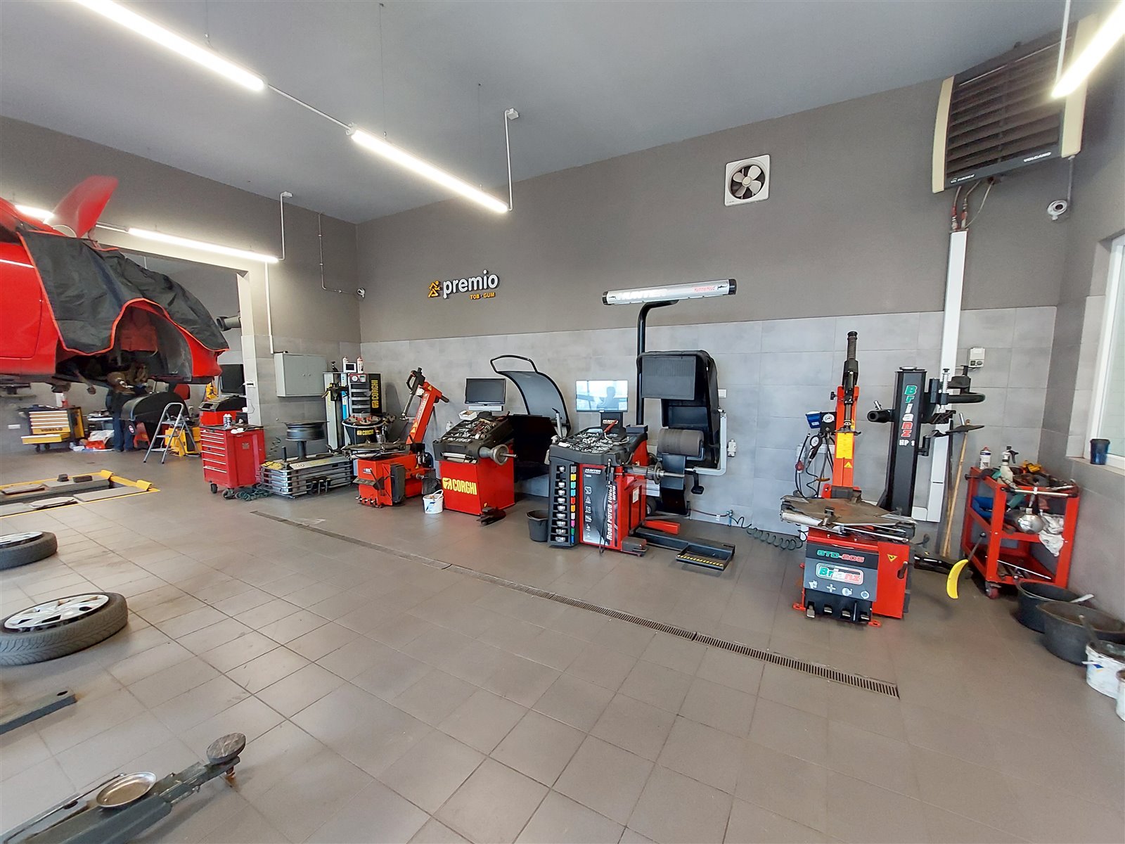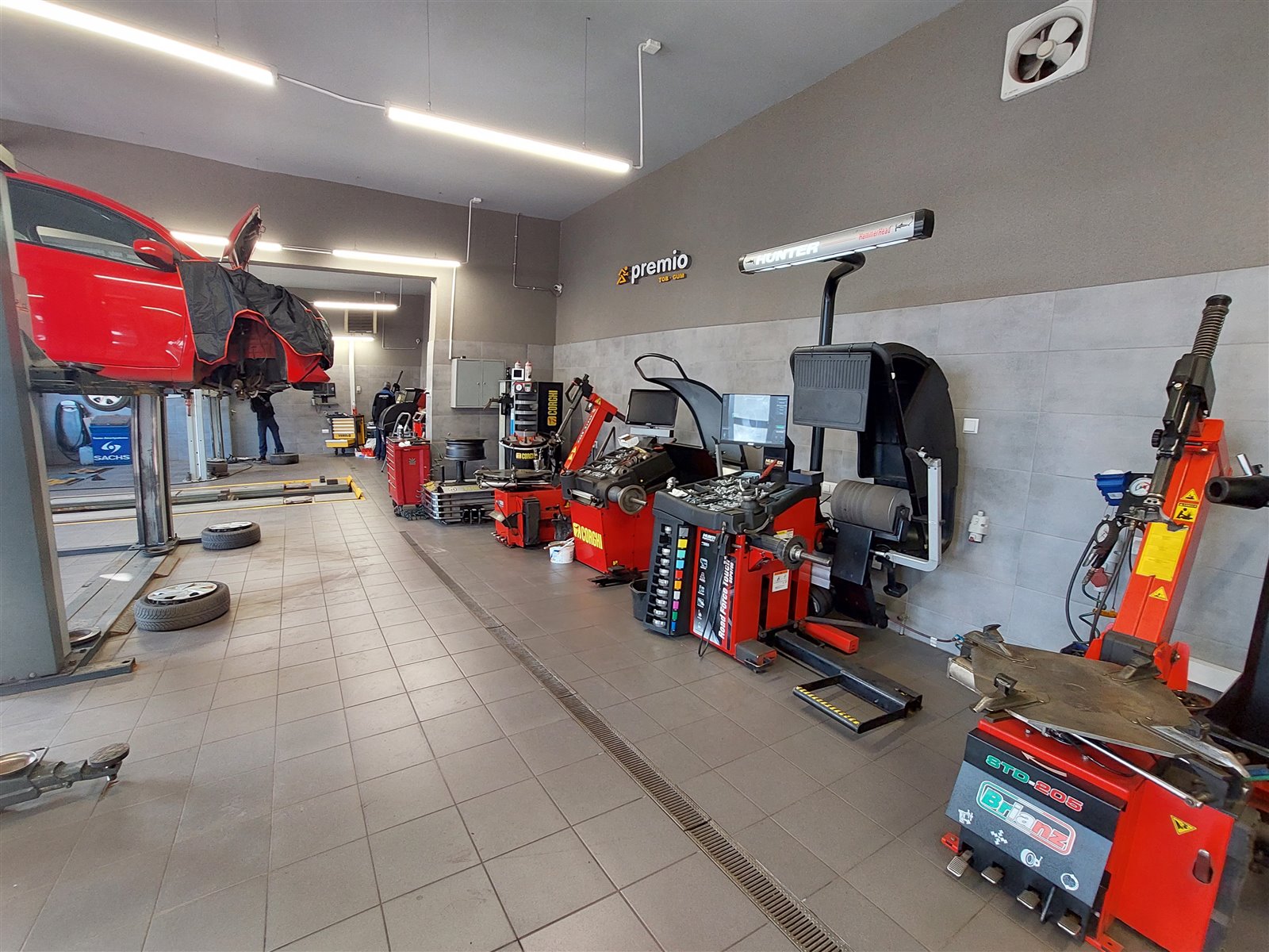 4x Wyważarki Hunter, Corghi) 6x montażownice z przystawkami RFT, 2x podnośnik nożycowy 1x ponośnik nożycowy diagnostyczny, 3x podnośnik kolumnowy, 2x kompresor 500l, 3x urządzenie do klimatyzacji texa r134a yf1234, urządzenie do dynamicznej wymiany oleju, 3x tablety diagnostyczne przeglądowe, 2x komputery diagnostyczne KTS, Wurth, wózki narzędziowe, urządzenie do wymiany płynu hamulcowego, urządzenie do Czyszczenia Systemu Wtrysku Paliwa LIQUI MOLY Jet Clean Tronic, urządzenie do geometri kół 3d Hunter, Piec z podajnikiem 49kw, urządzenie do prostowania felg aluminiowych, wytwornica azotu, nagrzewnica olejowa, dmuchawy powietrza 4szt, Spawarka migomat, system nagłośnienia stanowisk, kliatyzowane pomieszenia obsługi, termopres do naprawy opon, 4 wyposażone stanowiska obsługi z czytnikami dowodów rej, czytnik kluczyków BMW Keys Reader, inflatory do opon, 3x tv multimedialne , myjka ciśnieniowa, zlewarki, separatory powietrzza, oraz wiele innych jak klucze pneumatyczne itd