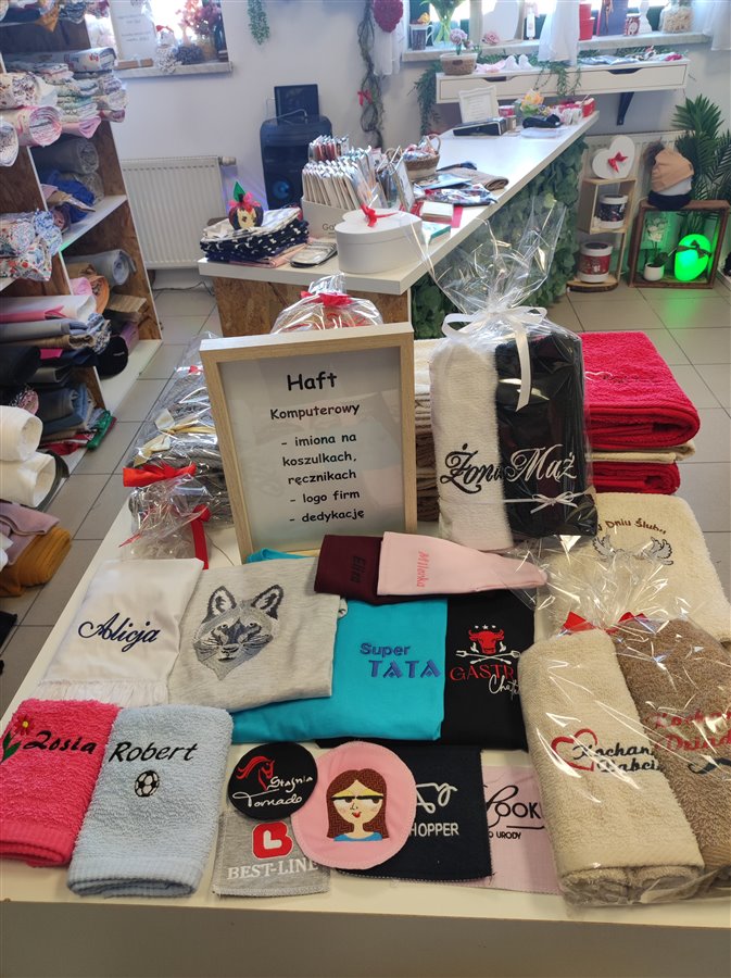 1 hafciarkę komputerową Haftex (modele 1502 PRO LINE) z oprogramowaniem Hatch Wilcom (wartość 6000 zł brutto) oraz zestawem tamborków i body do haftu na koszulkach,