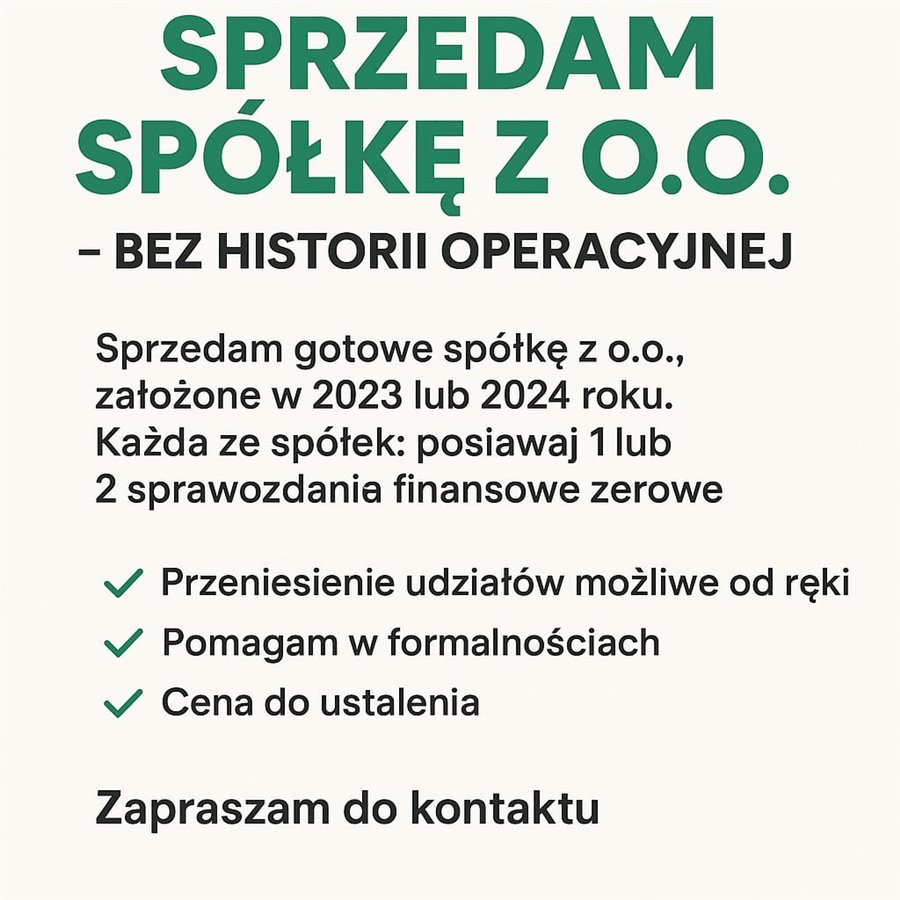 Sprzedam gotowe spółki z ograniczoną odpowiedzialnością, założone w 2023 lub 2024 roku. Każda ze spółek: