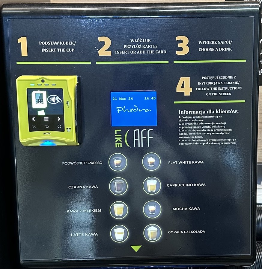 8 rodzajów kawy i gorącej czekolady, możliwość sprzedaży herbaty i innych napojów. Wydajność każdego ekspresu do 100 kubków kawy dziennie.