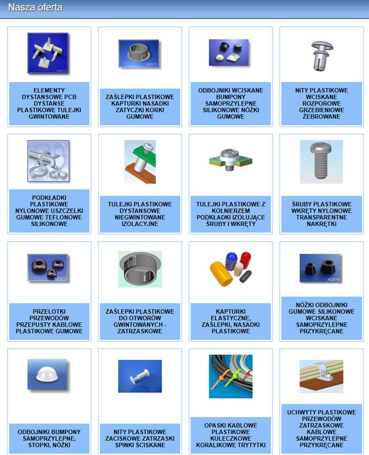 Działamy w branży fasteners - sprzedajemy hurtowo elementy montażowe(mechaniczne)do elektroniki, zaślepki, wkręty i wiele innych pozycji z tworzyw sztucznych.