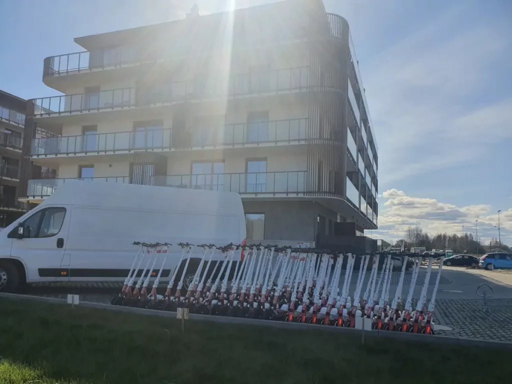 450 sprawnych elektrycznych hulajnóg sharingowych 350W z wymiennymi bateriami zabezpieczonymi kluczem.