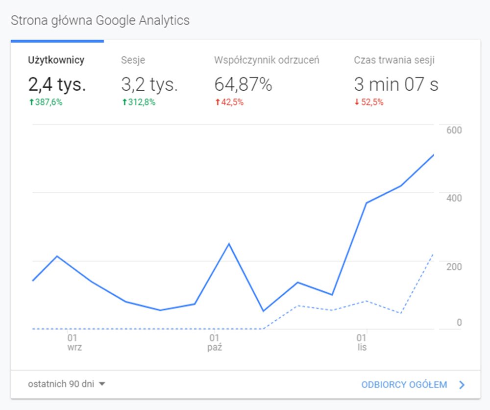 - Podpięty pod Google Analytics i Search Console.
