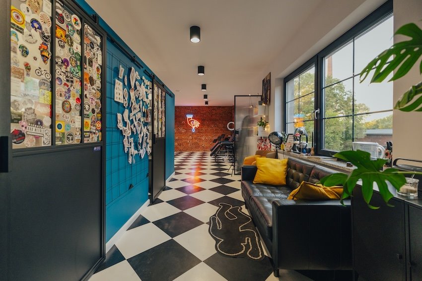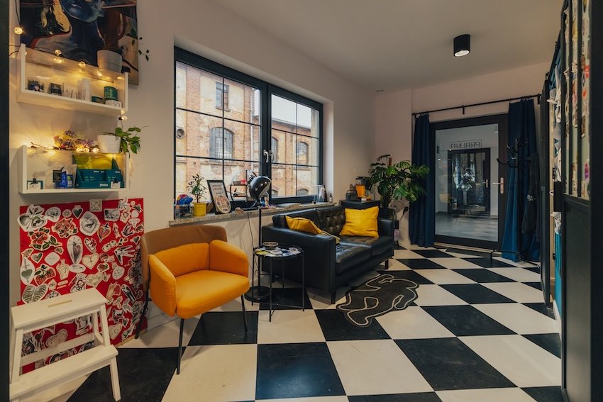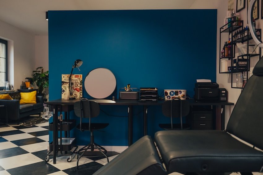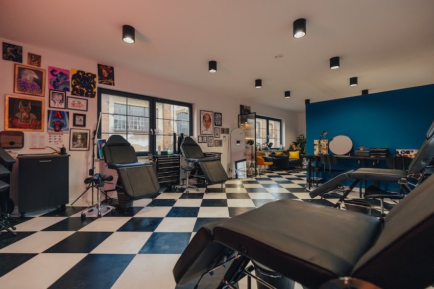 Lokal ma 56 m² i podzielony jest na trzy pomieszczenia: socjal, pokój do piercingu oraz salę tatuażu z poczekalnią.
