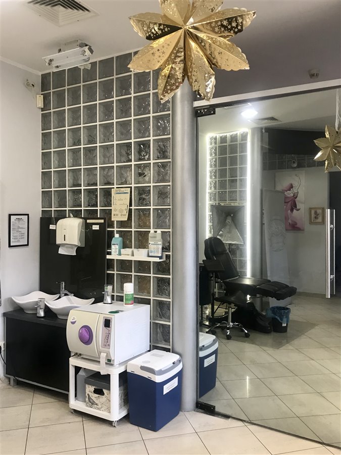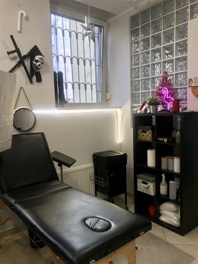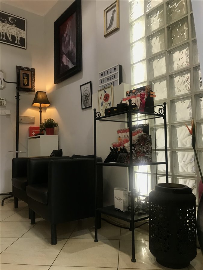Powierzchnia ok 60 m2 : poczekalnia, sala do tatuowania z 3 stanowiskami pracy, biuro, zaplecze, toaleta, dodatkowe małe pomieszczenie- dla nas magazynek.