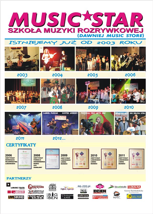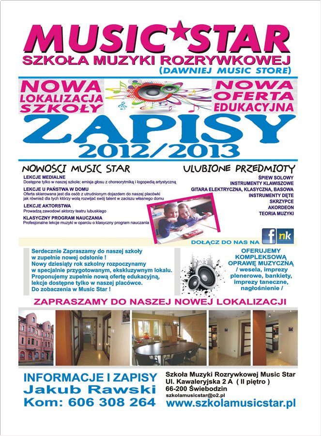 Proponujemy Państwu do sprzedania Szkołę Muzyki Rozrywkowej Music Star z 10 letnią tradycją. Placówka mieści się w Świebodzinie i jest popularnym miejscem integracji środowiska muzycznego całego województwa lubuskiego. Warto wspomnieć iż jest to jedyna taka szkoła w Świebodzinie oraz w obrębie całego powiatu.Cele szkoły to; nauka, promocja, koncerty, tworzenie warunków dla edukacji muzycznej dzieci, młodzieży z rodzin mniej zamożnych oraz patologicznych. Szkoła funkcjonuje również jako agencja koncertowa, na swoim koncie posiada ponad 350 zorganizowanych koncertów w Kraju i za granicą. Music Star jest czterokrotnym zdobywcą Certyfikatu Lubuskiego Lidera Biznesu 2009 - 2012