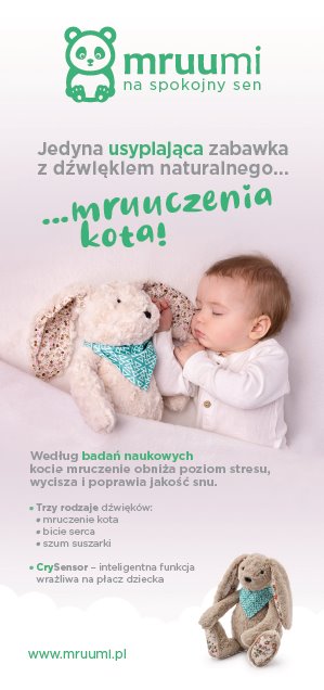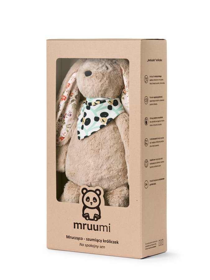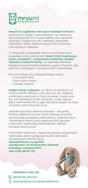 Króliczek Mruumi Jedyna szumiąca przytulanka na rynku polskim, jak i europejskim, z białym szumem w postaci dźwięku "naturalnego mruczenia kota".