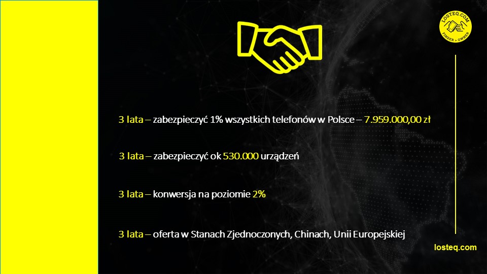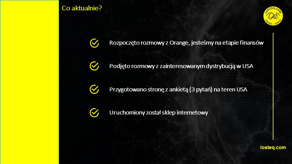 Technologia jest znakomitym rozwiązaniem na zabezpieczenie firm na wypadek zagubienia sprzętu przez pracownika i konsekwencje karne wynikające z Rodo. Cała technologia jest gotowa włączając stronę, sklep, ankietę na rynek Stanów Zjednoczonych. Wstępne zainteresowanie wykazał już jeden ze znaczących operatorów telefonii komórkowej. W ramach pakietu chciałbym dodać zarejestrowaną w 2016r spółkę, która jest właścicielem technologii.