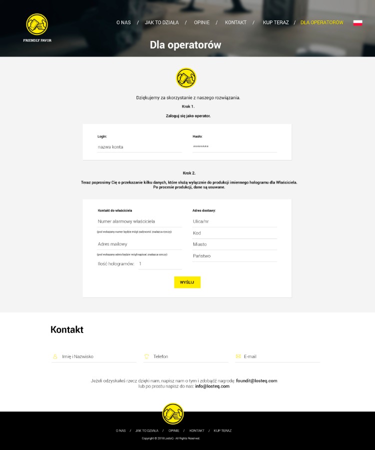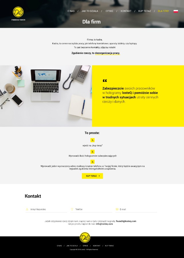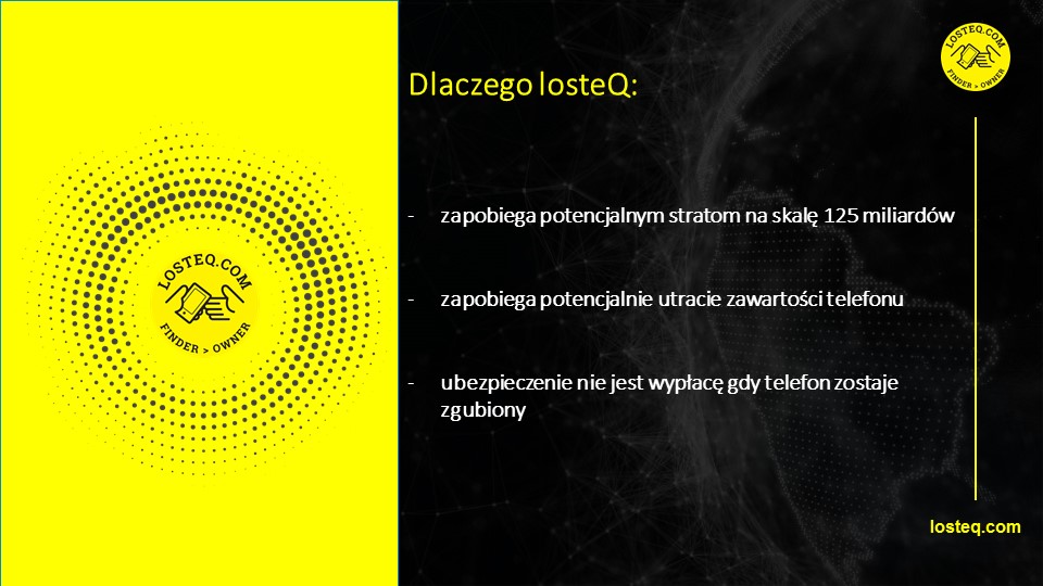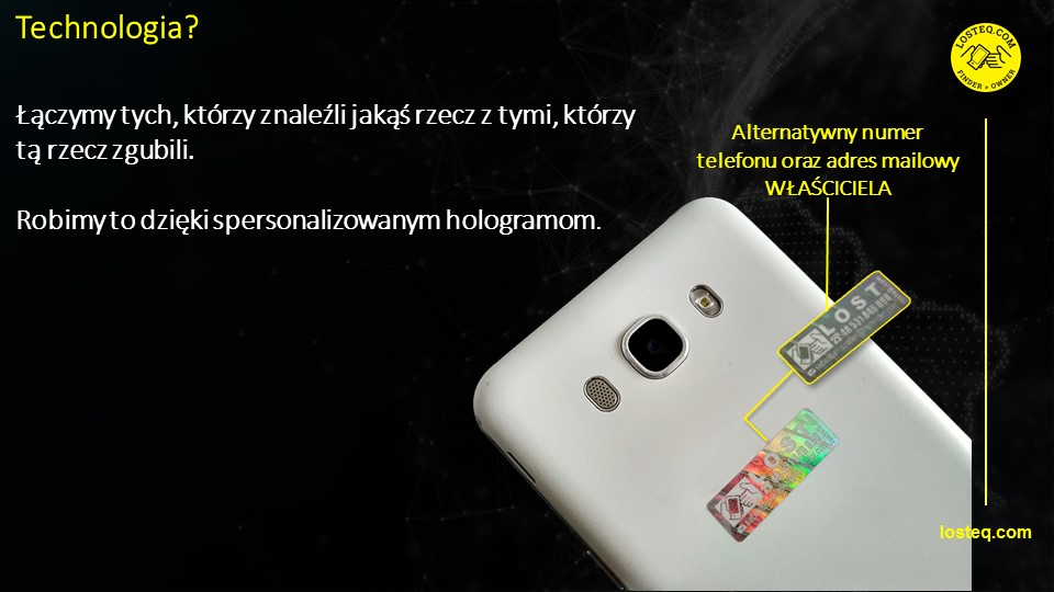 Chciałbym Państwu zaproponować zakup technologii losteQ.com, która łączy tych, którzy znaleźli jakąś rzecz, z tymi, którzy tą rzecz zgubili. To spersonalizowany hologram, w którym znajdziemy ukryte dane właściciela takie, jak (adres mailowy i numer telefonu) do bezpośredniego kontaktu. Natychmiastowy zwrot rzeczy.