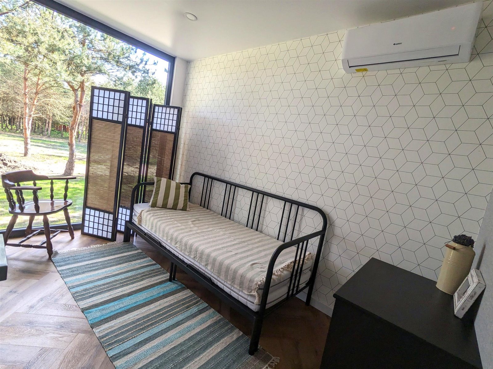 • Całoroczny domek typu Tiny House posadowiony na przyczepie podkontenerowej, starannie zaprojektowany i wyróżniający się na tle innych podobnych rozwiązań