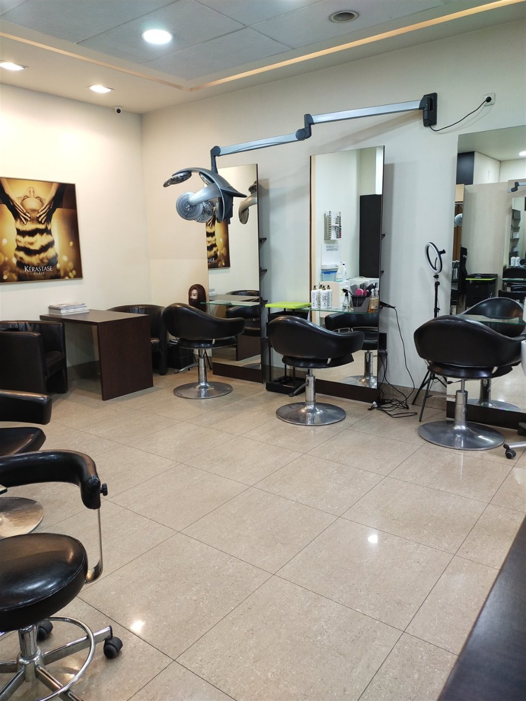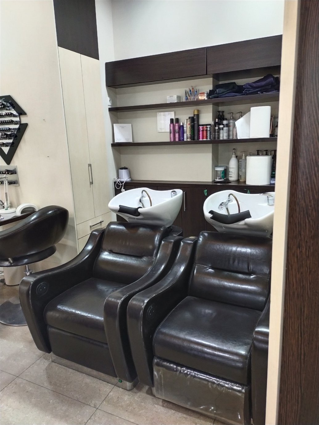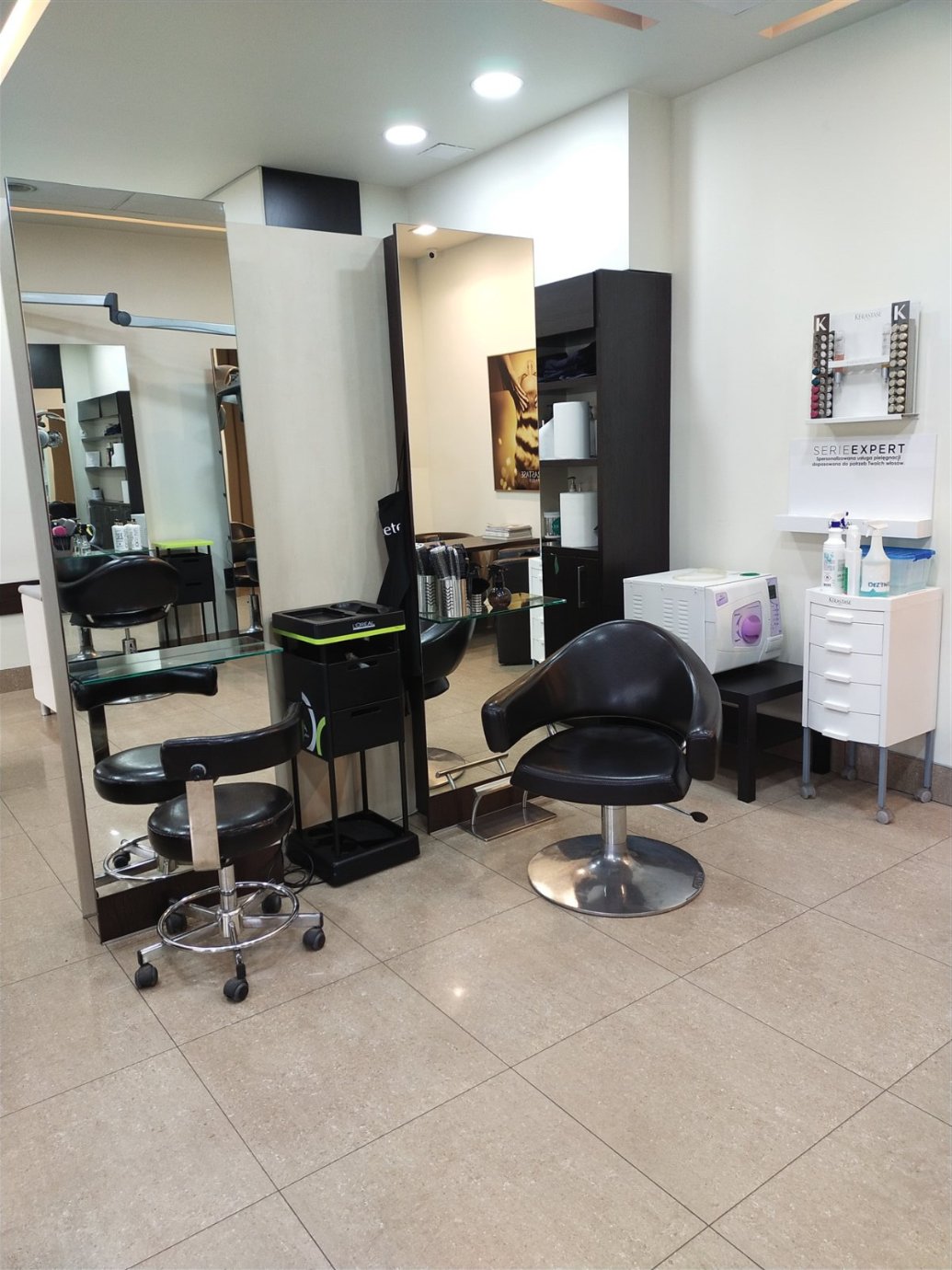 Dodatkowo salon oferuje pełen zakres narzędzi i akcesoriów fryzjerskich, takich jak lokówka, prostownica, 2 maszynki do strzyżenia, suszarka do włosów oraz różne spinki do włosów. W ofercie znajdują się także różnego rodzaju preparaty kosmetyczne.