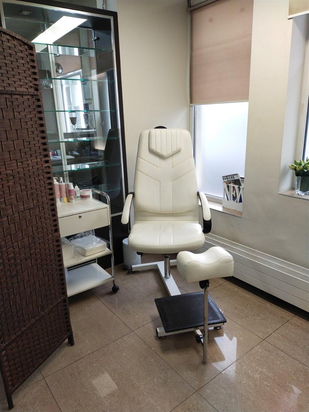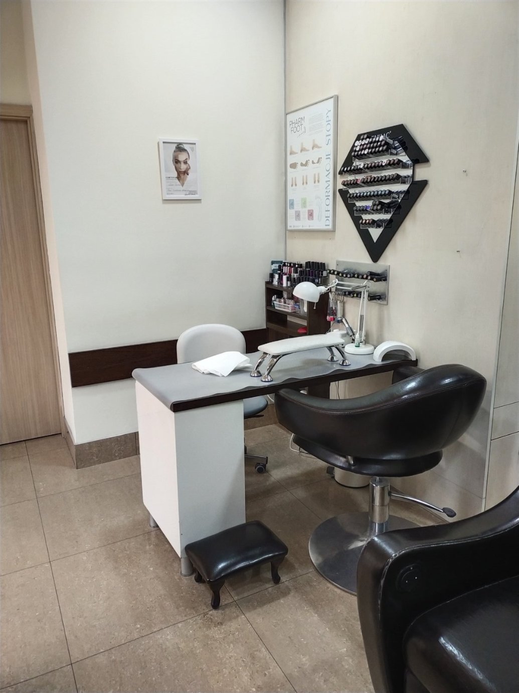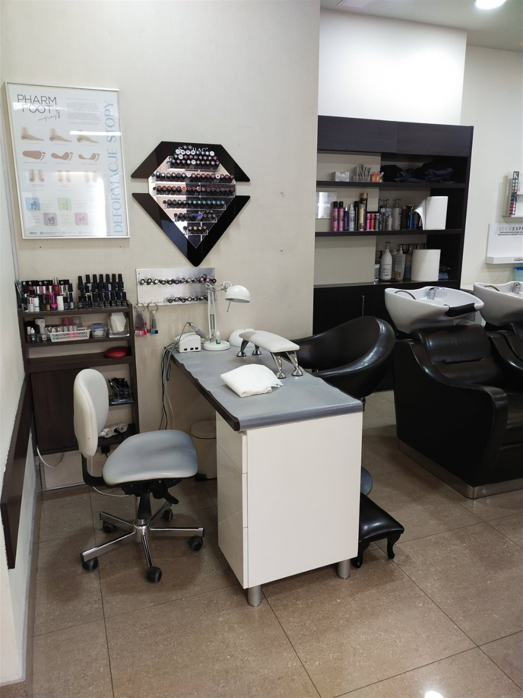 Część salonu jest dedykowana manicure i pedicure, gdzie znajdują się specjalne meble i narzędzia, takie jak fotel dla klienta, fotel dla mistrza, stół do manicure, fotel do pedicure, lampa LED, lampa do oświetlenia, frezarka, pochłaniacz, frezy, nożyczki, cążki oraz lakiery hybrydowe i klasyczne, a także inne materiały eksploatacyjne do manicure i pedicure.