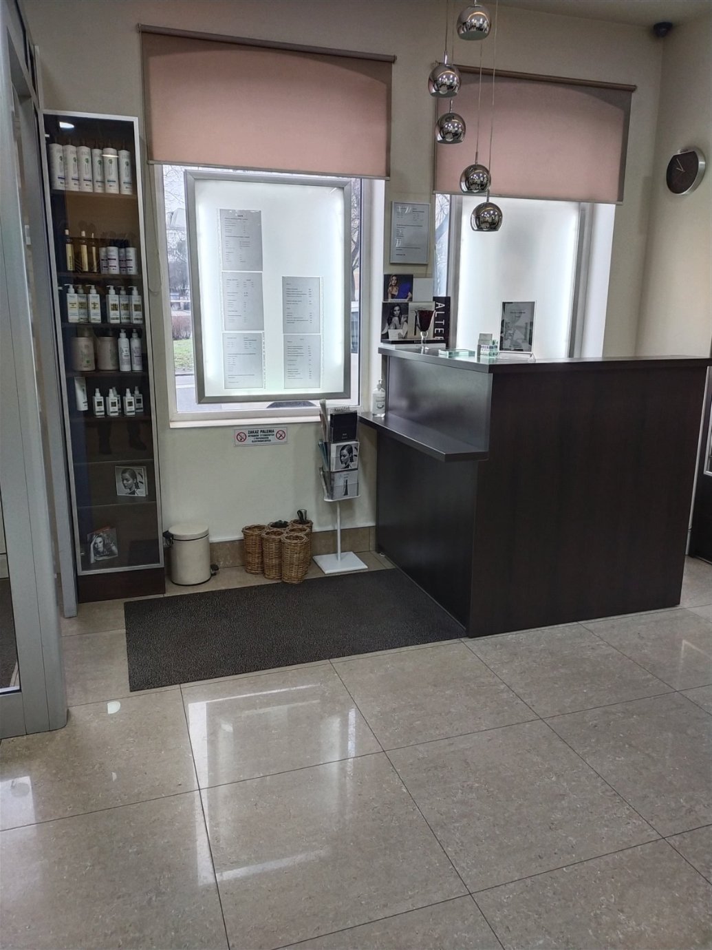 W lokalu znajduje się także gabinet kosmetyczny, wyposażony w fotel elektryczny, 2 fotele oczekujące, lampę ze szkłem powiększającym, umywalkę oraz szafki i półki.