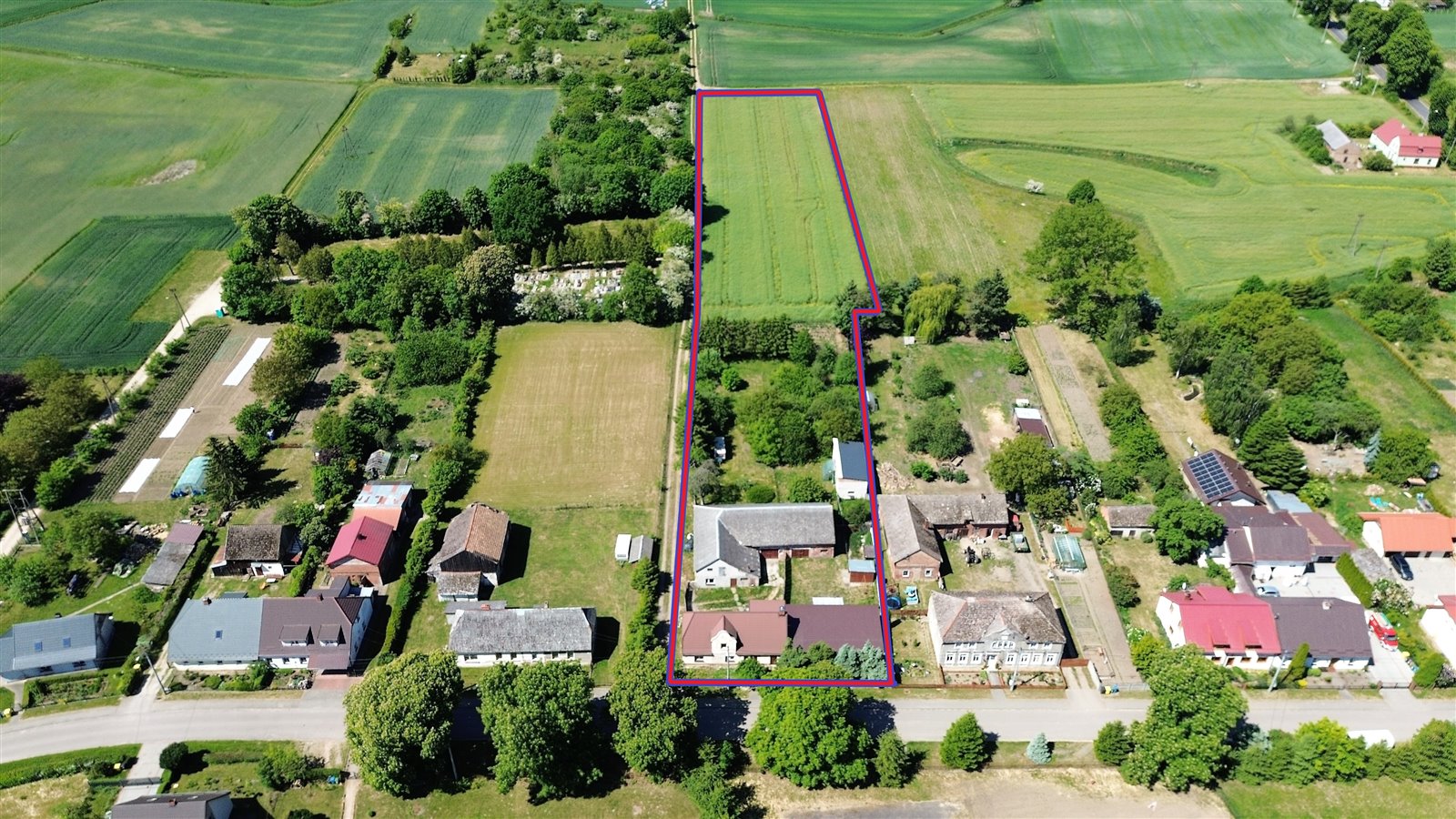 Dwie z zabudowaniami 149/2 o powierzchni 0,1422 m2 i 149/1 o powierzchni 0,1223 m2 oraz grunt 149/3 o powierzchni 7394 m2.