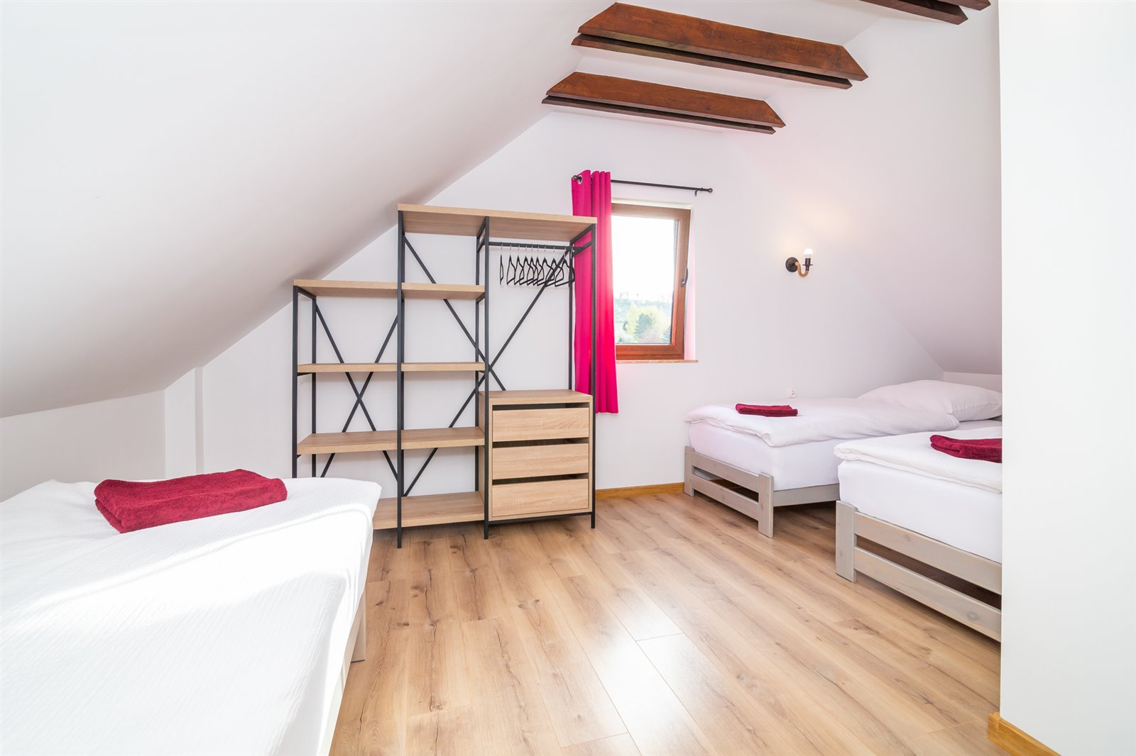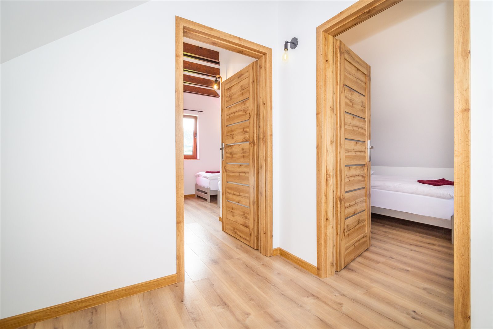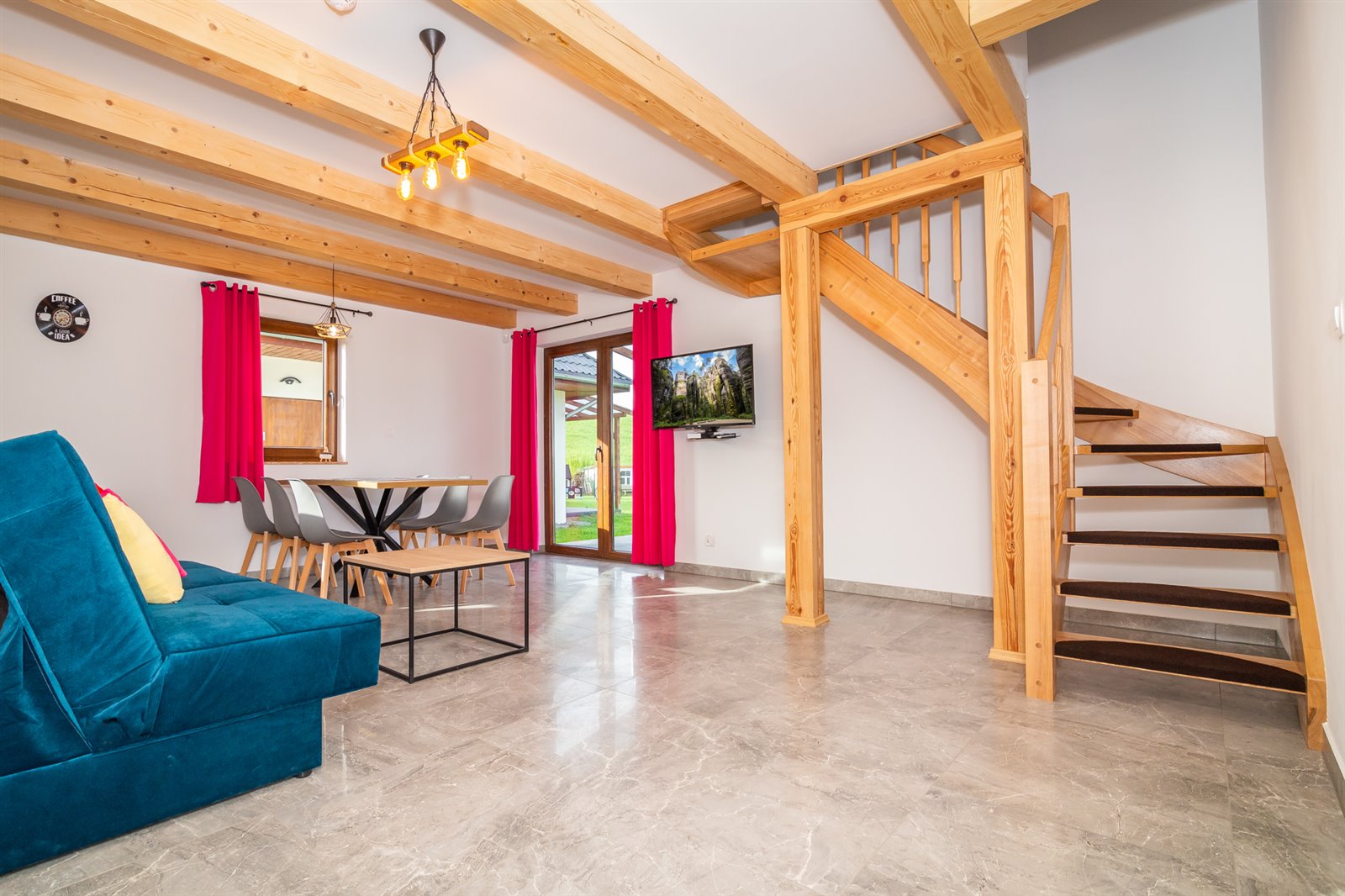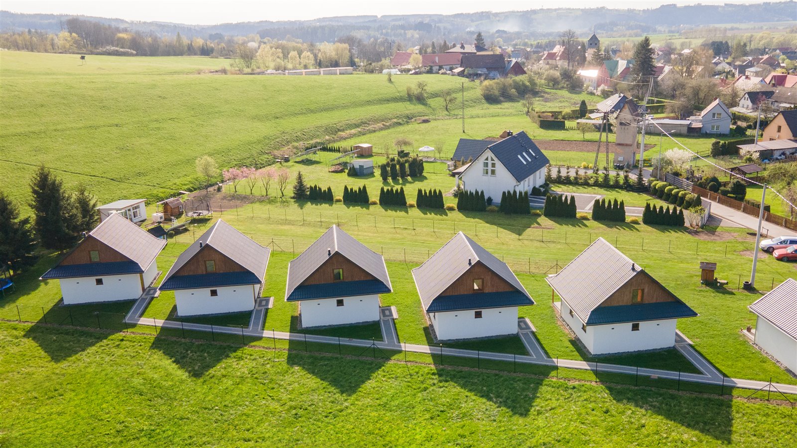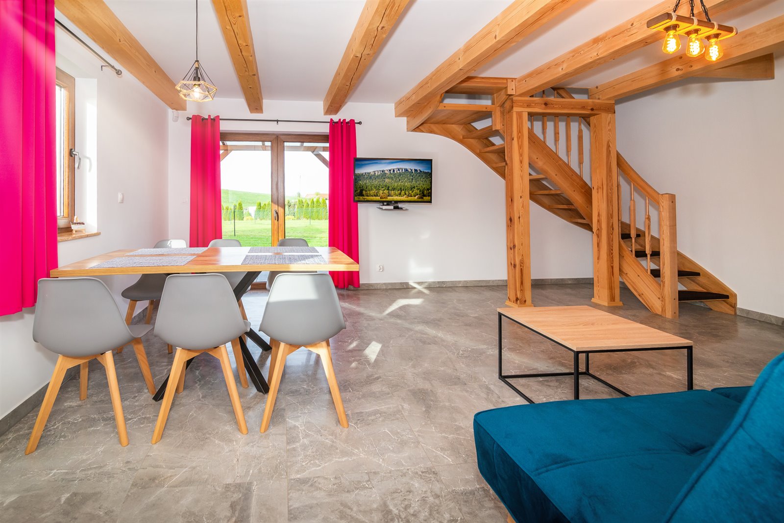 Kompleks rekreacyjno-wypoczynkowy 5 (+1 dom murowany, wolnostojący o pow. 20 m2) domów wolnostojących każdy o powierzchni 54 m2. Na parterze znajduje się przestronny salon z TV, stół na 6 osób, aneks kuchenny z wyposażeniem (sztućce, talerze, garnki, szklanki, kieliszki, czajnik, kuchenka mikrofalowa, płyta indukcyjna, lodówka, ekspres do kawy, żelazko, deska do prasowania) stół barowy, hoker, łazienka z prysznicem, umywalką i WC. Na piętrze 2 oddzielne sypialnie 2 i 3-osobowe z widokiem na góry.