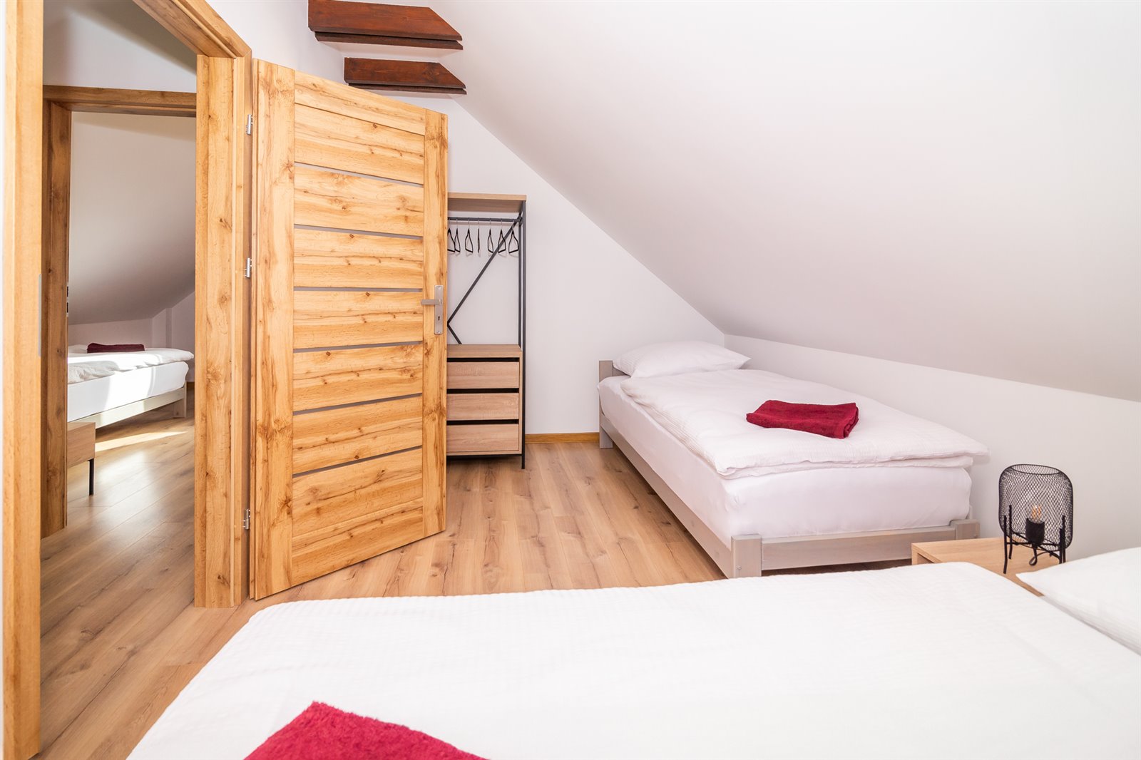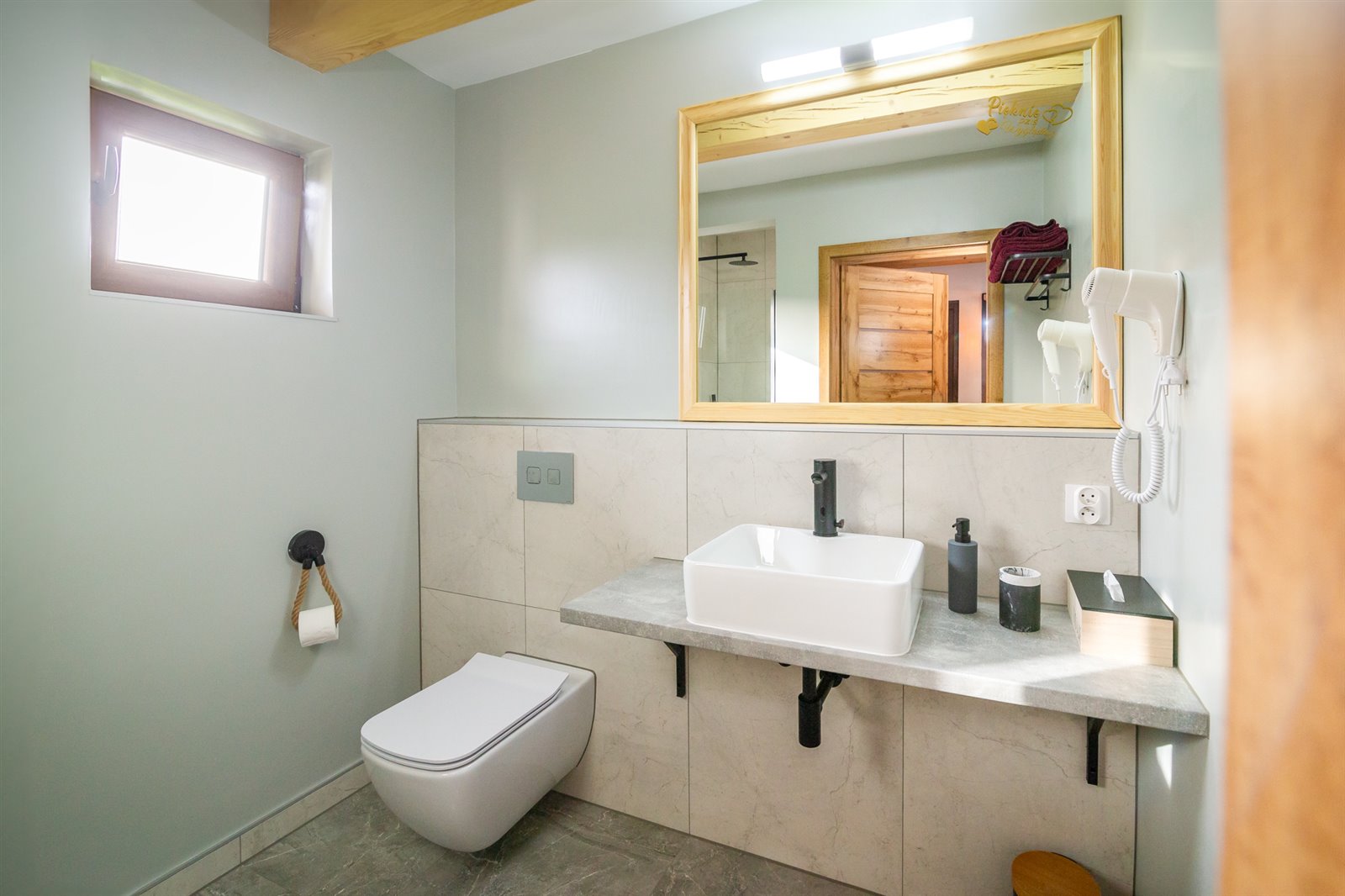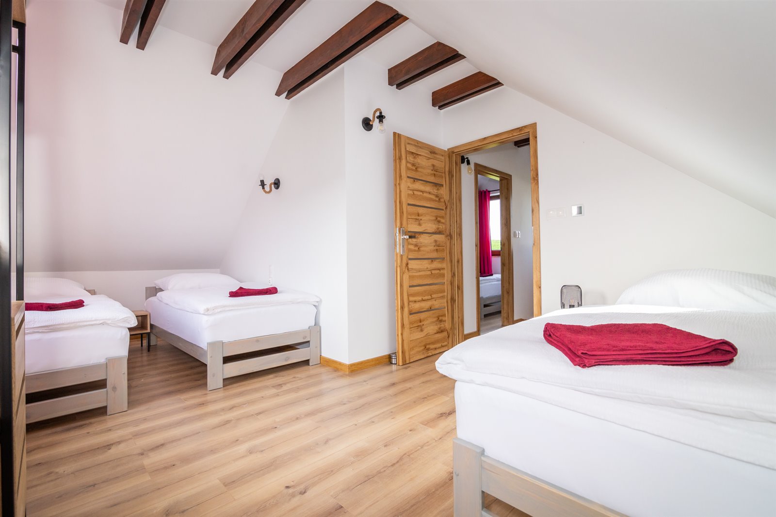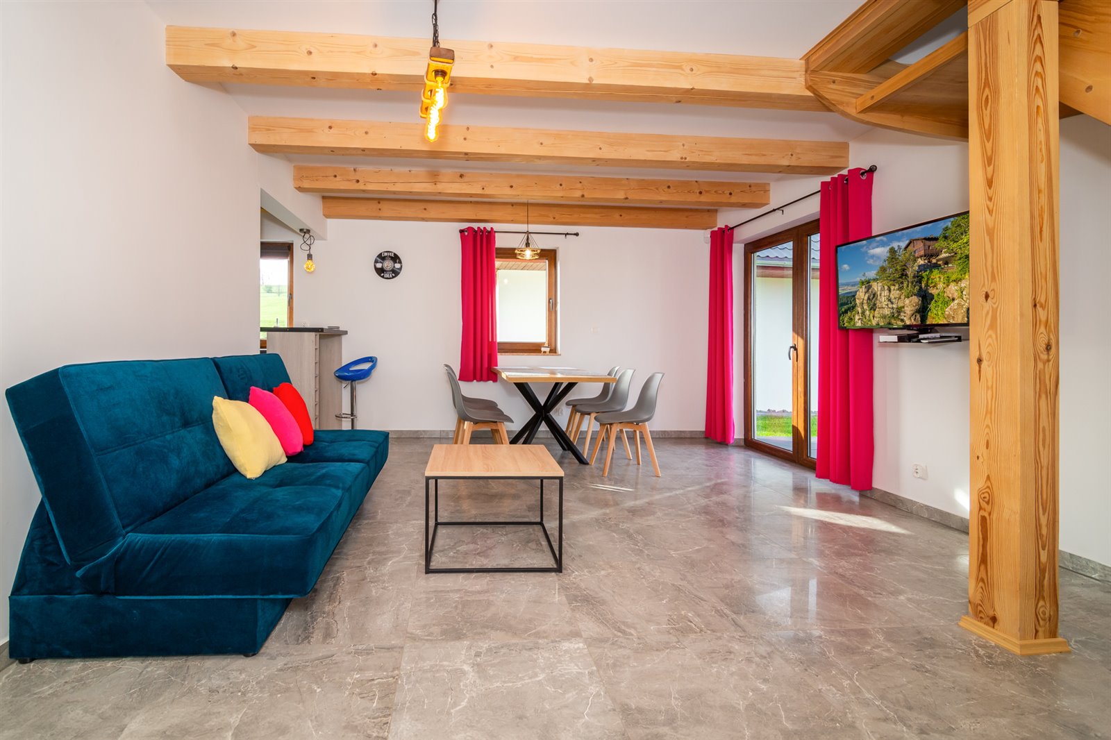 Kompleks rekreacyjno-wypoczynkowy 5 (+1 dom murowany, wolnostojący o pow. 20 m2) domów wolnostojących każdy o powierzchni 54 m2. Na parterze znajduje się przestronny salon z TV, stół na 6 osób, aneks kuchenny z wyposażeniem (sztućce, talerze, garnki, szklanki, kieliszki, czajnik, kuchenka mikrofalowa, płyta indukcyjna, lodówka, ekspres do kawy, żelazko, deska do prasowania) stół barowy, hoker, łazienka z prysznicem, umywalką i WC. Na piętrze 2 oddzielne sypialnie 2 i 3-osobowe z widokiem na góry.