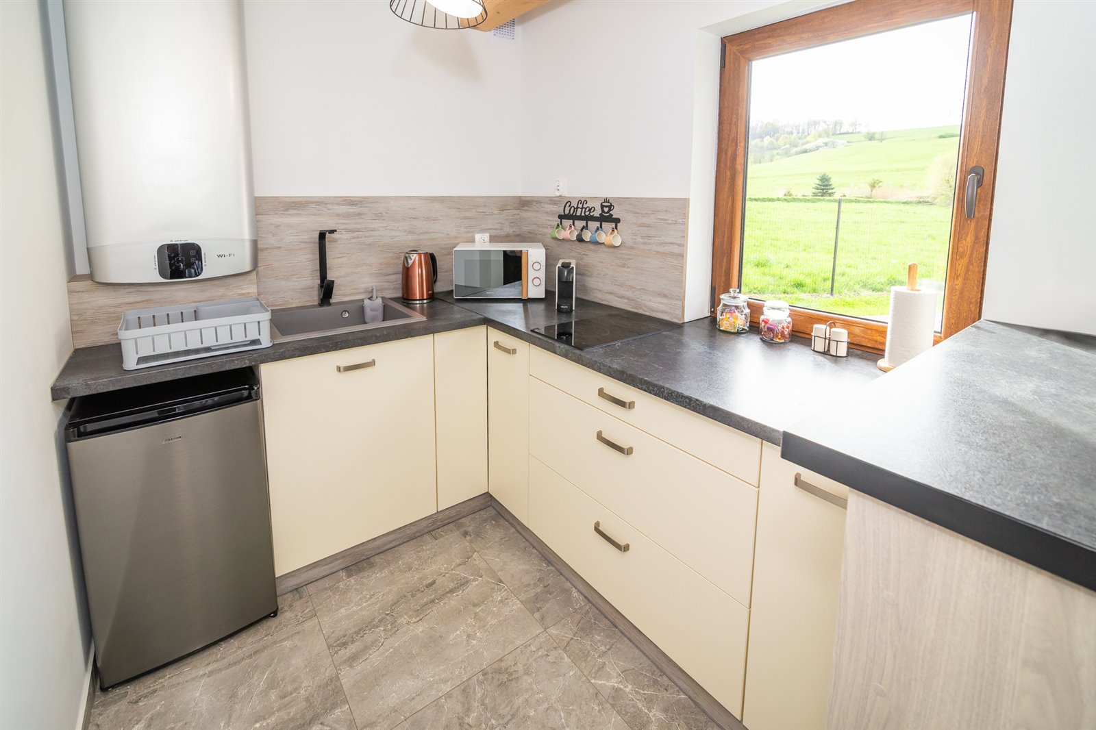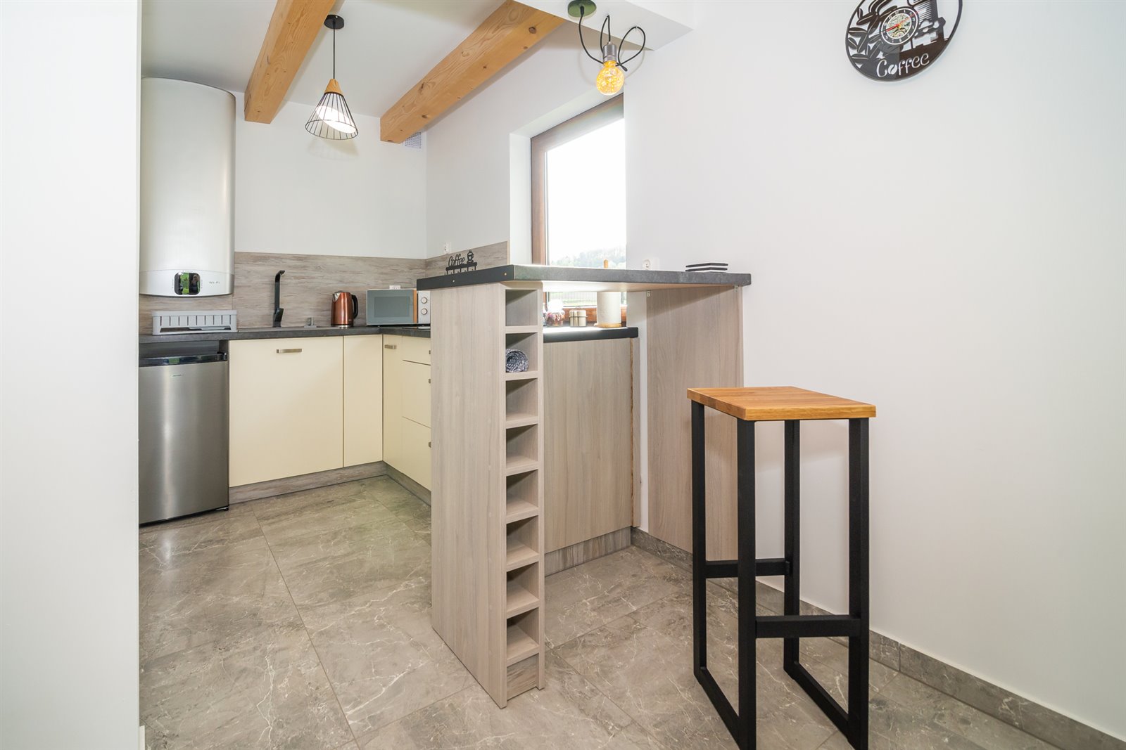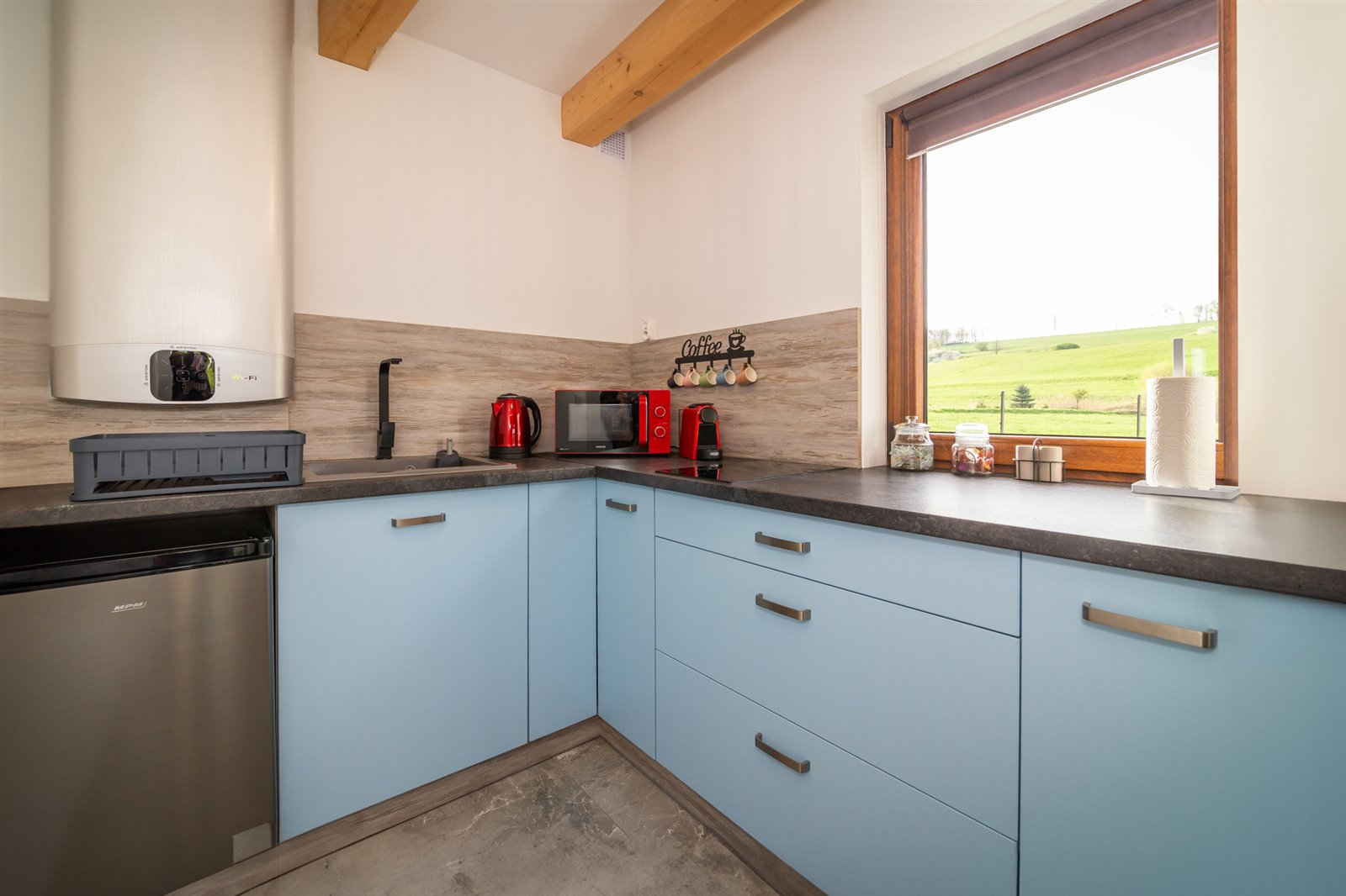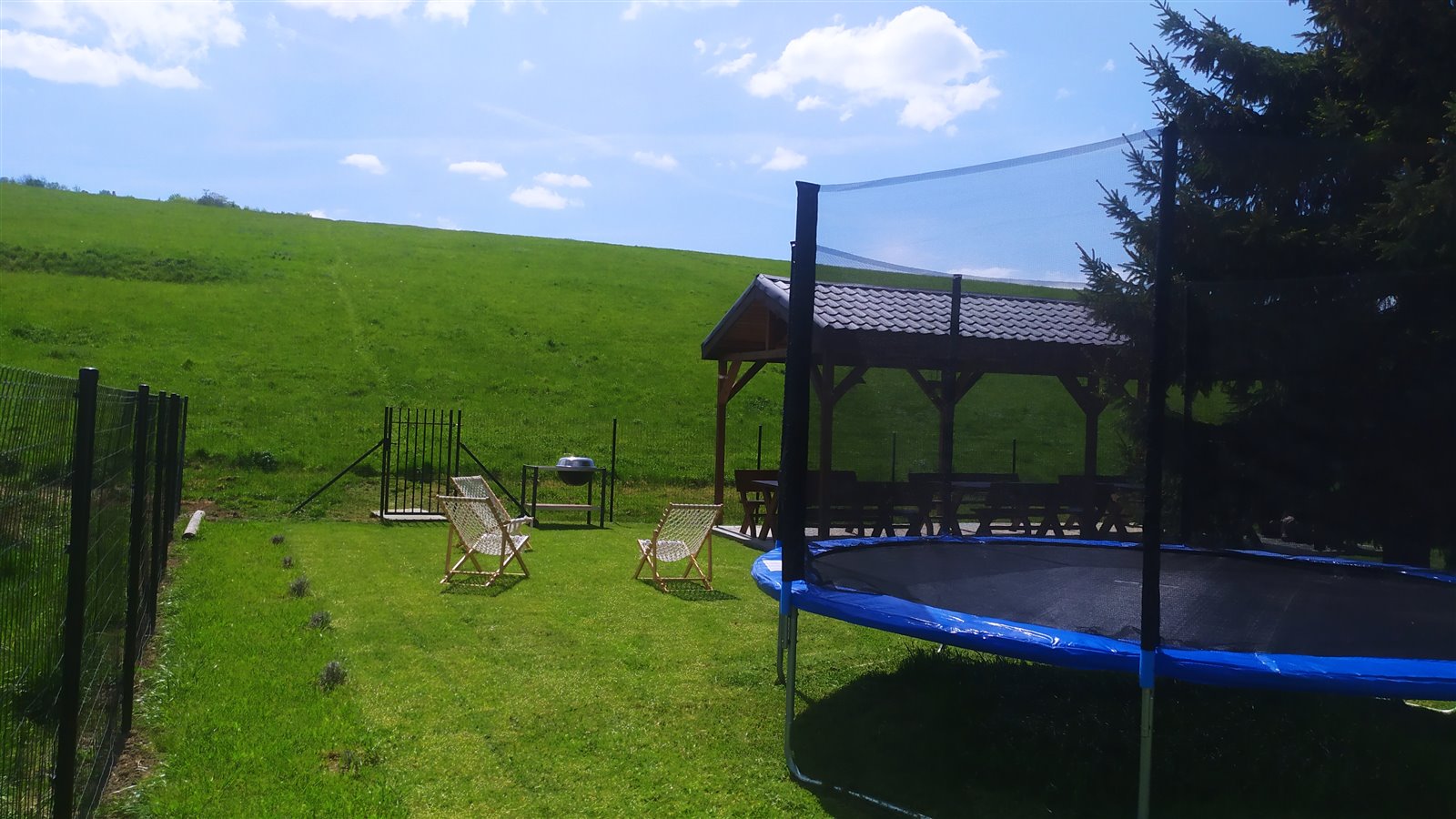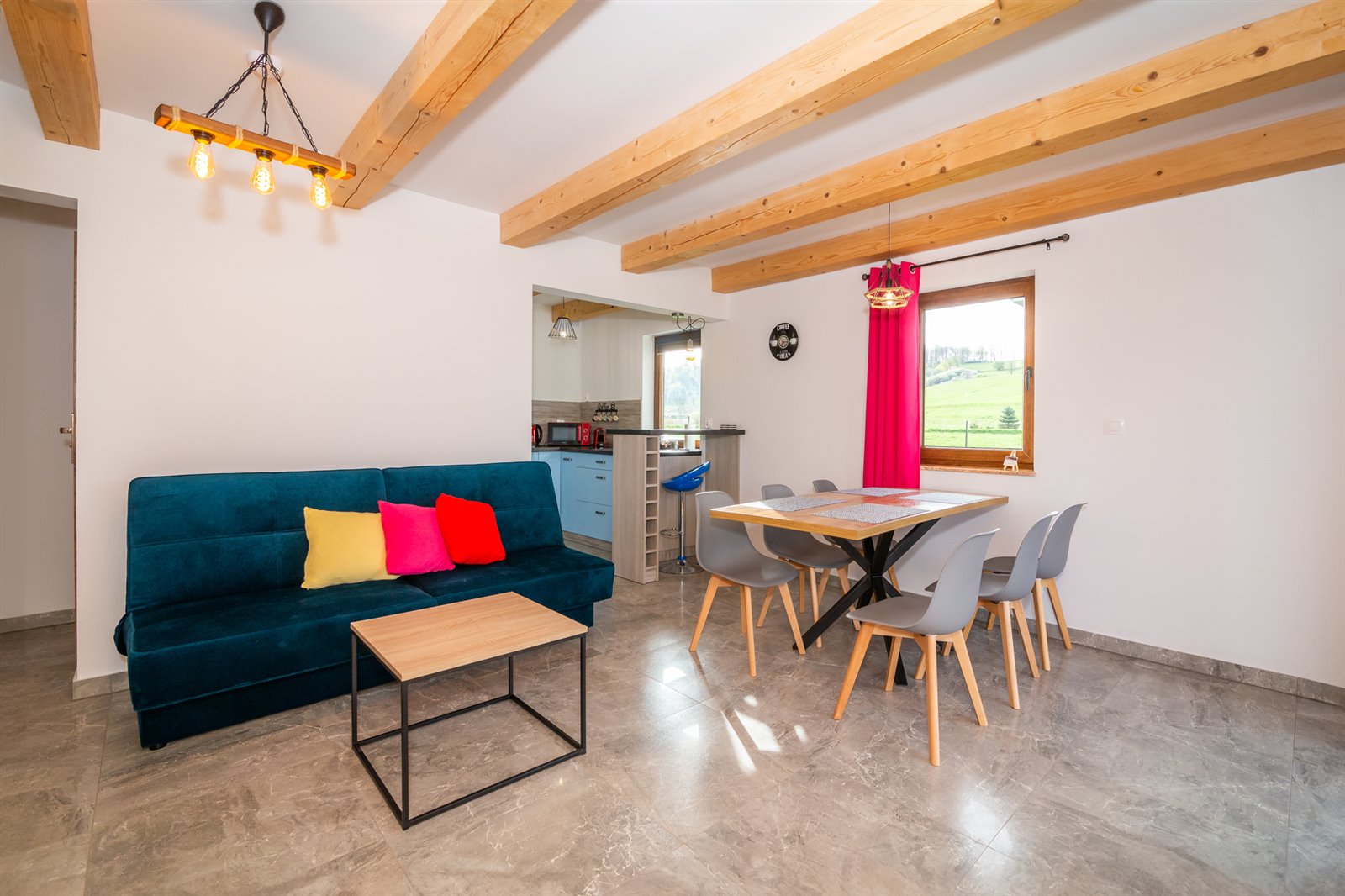 Kompleks rekreacyjno-wypoczynkowy 5 (+1 dom murowany, wolnostojący o pow. 20 m2) domów wolnostojących każdy o powierzchni 54 m2. Na parterze znajduje się przestronny salon z TV, stół na 6 osób, aneks kuchenny z wyposażeniem (sztućce, talerze, garnki, szklanki, kieliszki, czajnik, kuchenka mikrofalowa, płyta indukcyjna, lodówka, ekspres do kawy, żelazko, deska do prasowania) stół barowy, hoker, łazienka z prysznicem, umywalką i WC. Na piętrze 2 oddzielne sypialnie 2 i 3-osobowe z widokiem na góry.