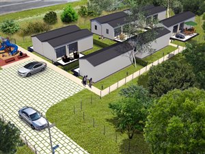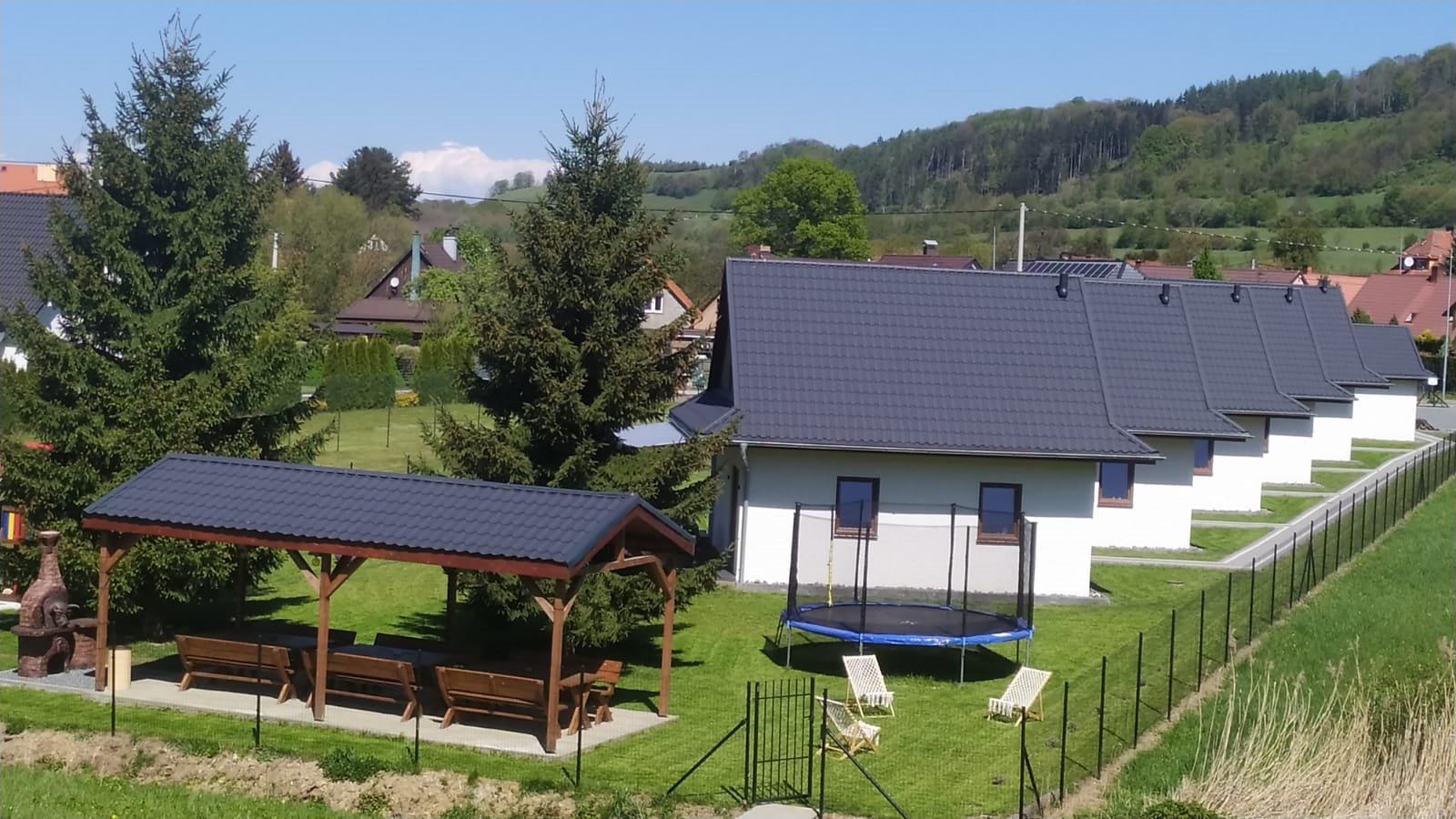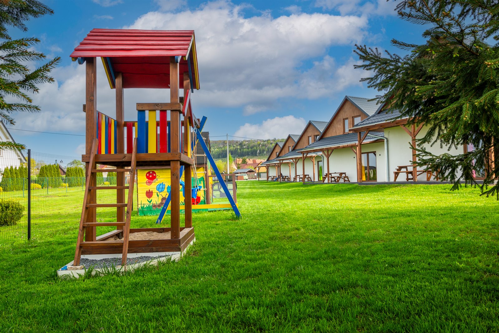 Domy przeznaczone na pobyt całoroczny. Do każdego domu przynależy zadaszony taras z ławko-stołem na 6 osób. Do dyspozycji ogród ze strefą zieleni, wiata ze stołami na 24 osoby, grill, plac zabaw z huśtawką, zjeżdżalnią, piaskownicą, trampoliną, chatką Baby Jagi.