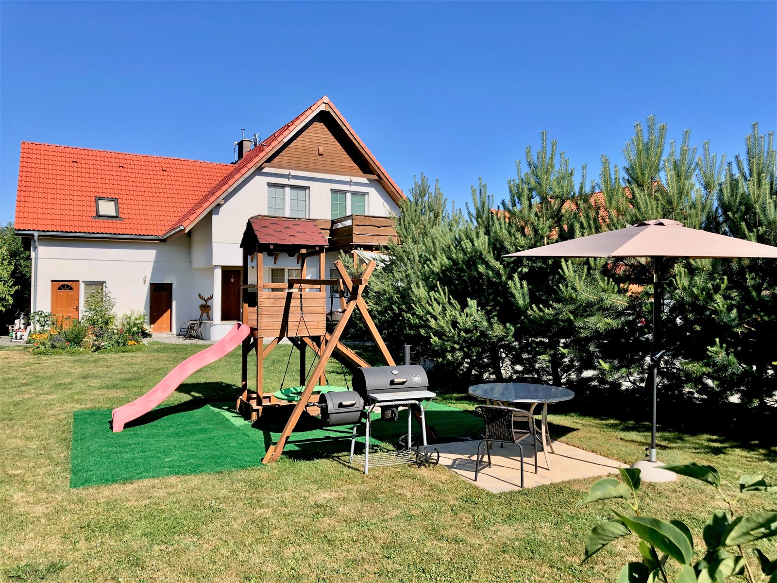 - wyjście do ogrodu- z wieloma drzewami owocowymi, krzewami, kwiatami.