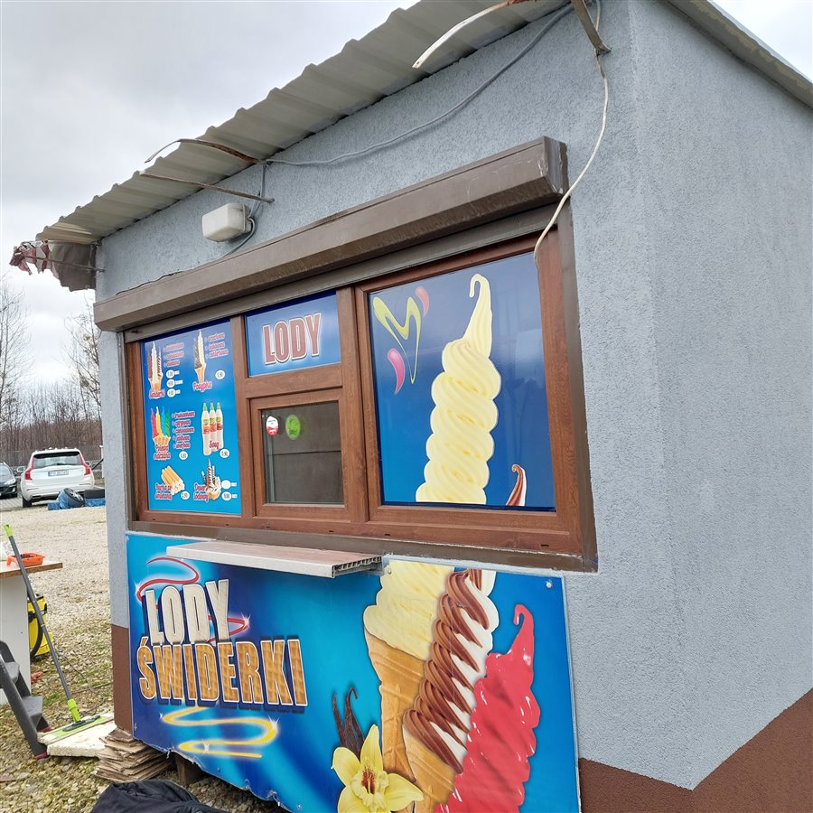 Dotychczas były sprzedawane lody i desery ale można przeznaczyć na gastronomie w czym pomoże profesjonalny okap ze stali nierdzewnej, dodatkowo posiadam baner reklamowy montowany na dachu.