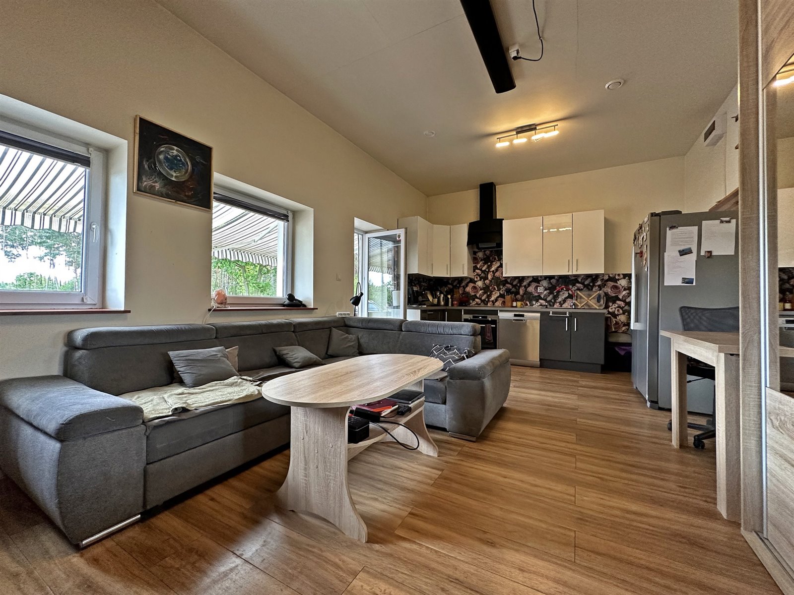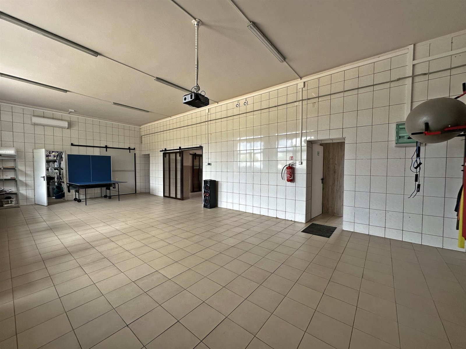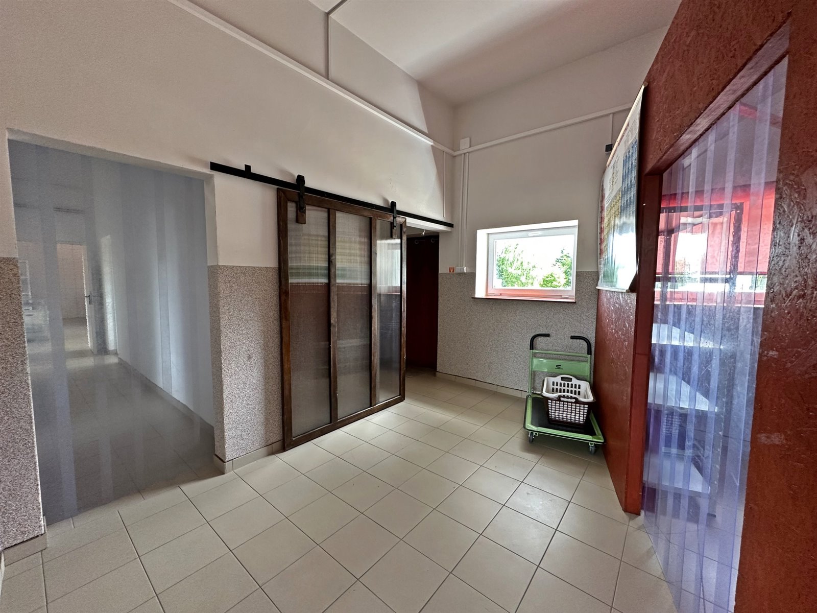 Z przodu budynku znajduje się wejście do części mieszkalnej. Składa się ona z salonu (z kominkiem) z aneksem kuchennym, łazienki, przedpokoju z szafą w zabudowie, spiżarki oraz nowej rozdzielni elektrycznej . Kolejno, z przedpokoju bezpośrednie wejście do sali produkcyjnej. Na lewo znajduje się część z drugim aneksem mieszkalnym, osobną kuchnią, łazienką oraz wygłuszony pokój z wyjściem na tyły budynku. Na prawo od sali wejście do kolejnych pomieszczeń oraz mały magazyn. W dalszej części budynku znajdują się dwa wyjścia na rampę, trzy sale mogące służyć za pomieszczenia produkcyjne bądź magazynowe, dwa małe magazyny oraz dwa pomieszczenia przeznaczone aktualnie do przygotowaań przedprodukcyjnych. Budynek posiada łącznie pięć wyjść.