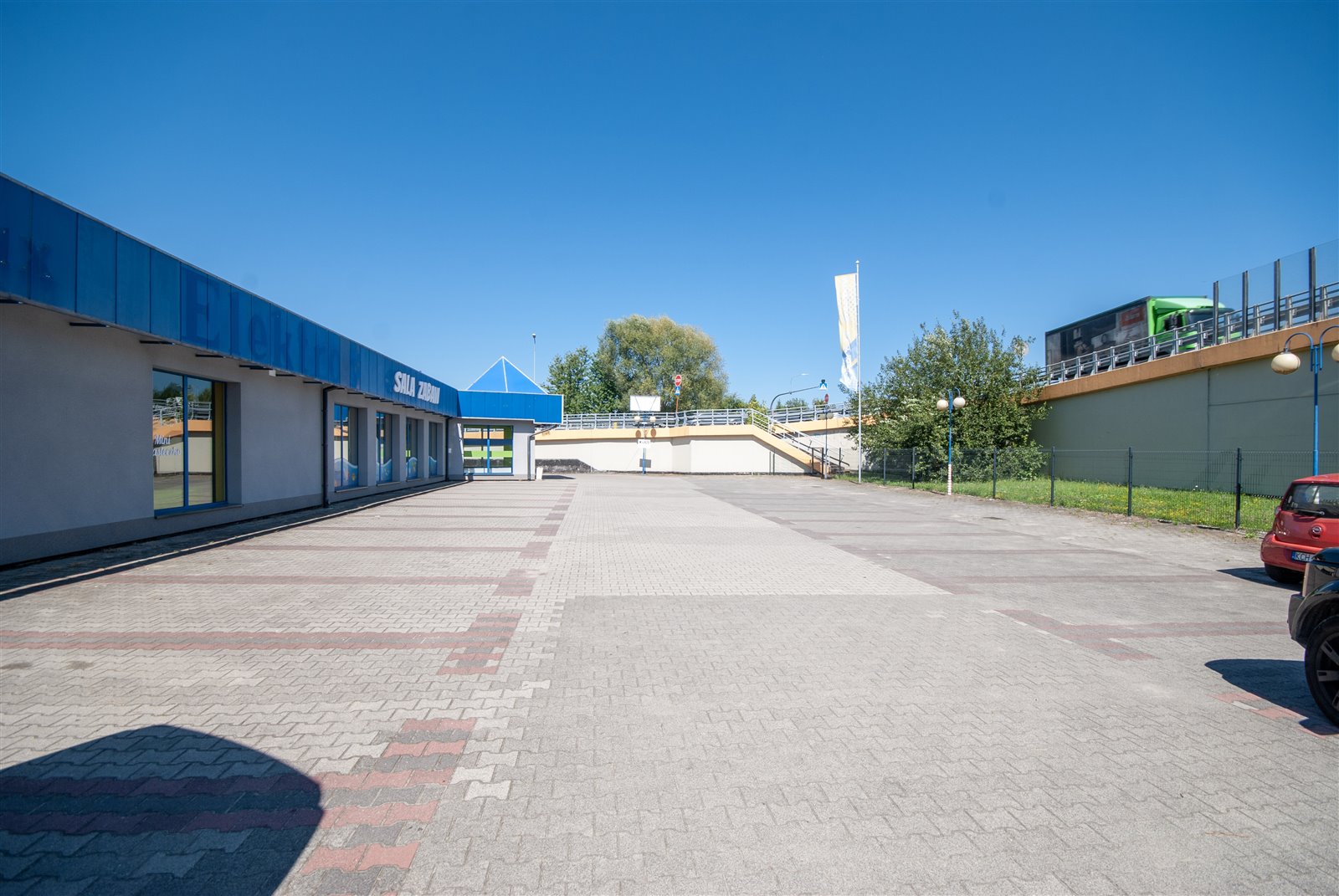 • Parking: Przed budynkiem znajduje się parking na 30 miejsc, a z tyłu duży plac manewrowy dla tirów oraz podjazdy i rampy przy magazynach.
