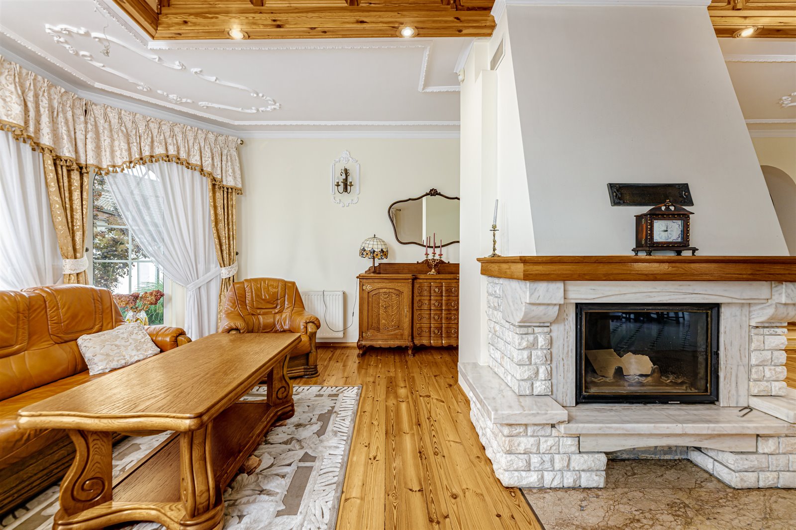 Dom składa się z przestronnego salonu z kominkiem i antresolą, 3 sypialni, 2 łazienek ( z czego jedna posiada jacuzzi i znajduje się w sypialni), 2 gabinetów, garderoby, wygodnej kuchni połączonej z jadalnią, wyposażonej we wszystkie niezbędne sprzęty AGD.