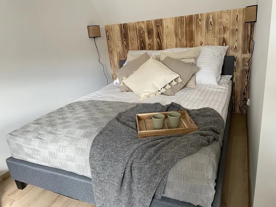 1. Pierwszy domek: W pełni wykończony i umeblowany, gotowy do zamieszkania lub wynajmu. Obecnie generuje dochód z wynajmu turystycznego.