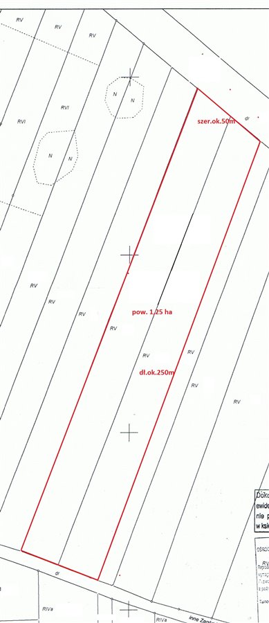 Działka o pow.1,25ha i wymiarach 50mx250m, media: prąd, woda,gaz i kanalizacja do podciągnięcia. Obecnie brak jest planu zagospodarowania przestrzennego. Zgodnie z zapisami nowego planu zagospodarowania przestrzennego teren działki ma być w całości przeznaczony pod działalność usługową, produkcyjną i handlową.