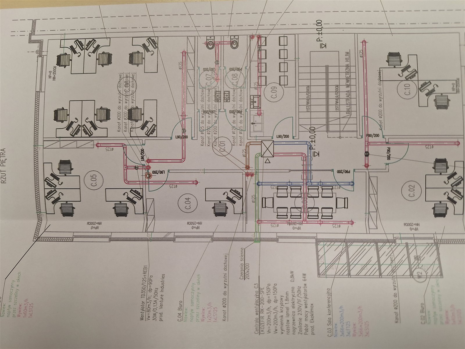 2. Budynek biurowo-socjalny o powierzchni 350 m² (parter i piętro). Na parterze biuro obsługi klienta, archiwum, szatnia, toaleta, stołówka, kuchnia, kotłownia. Na piętrze 5 pomieszczeń biurowych, sala konferencyjna, toaleta, kuchnia. Wentylacja mechaniczna i klimatyzacja. Ogrzewanie podłogowe (kocioł kondensacyjny o mocy 35 kWh).