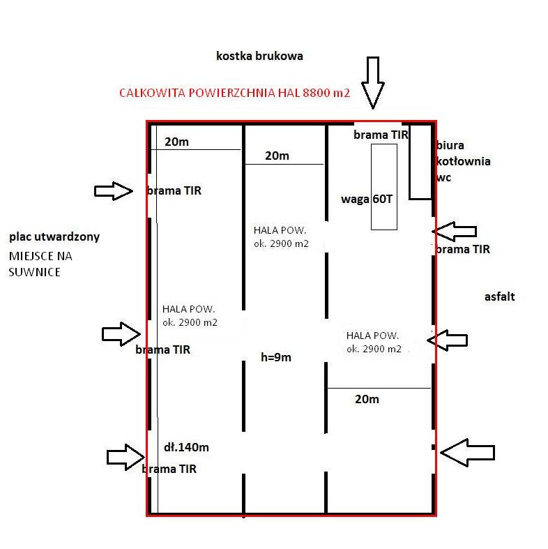 Do wynajęcia hala 3 nawowa o pow.8800m2 bramy TIR-możliwość wynajęcia tylko jednej nawy o pow.2800m2 lub dwóch naw o pow.5600m2, waga 60T wewnątrz hali.