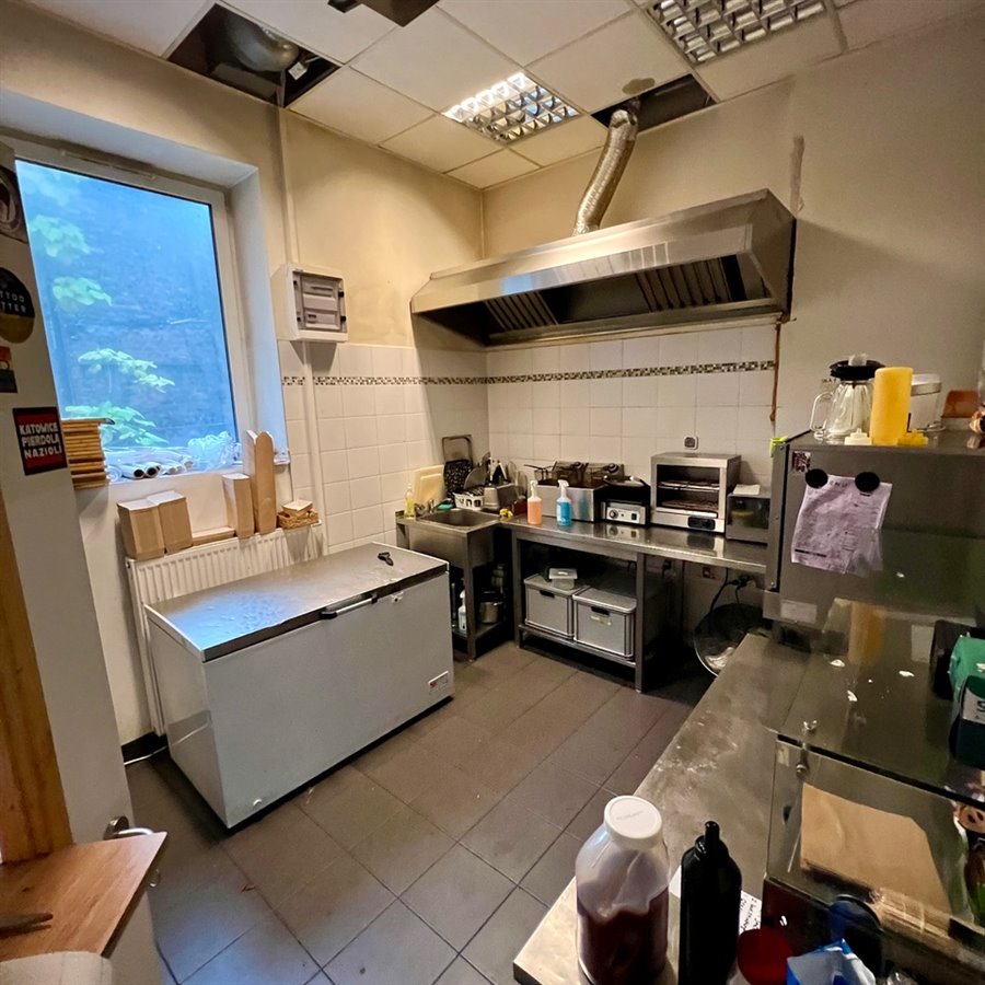 • Kuchnia: lodówka, zamrażarki, grille (2 sztuki), piec konwekcyjny, opiekacze (3 sztuki), lada chłodnicza 3-komorowa, płyta indukcyjna, okap kuchenny z wyciągiem, zlewozmywak 2-komorowy, szafki pracownicze