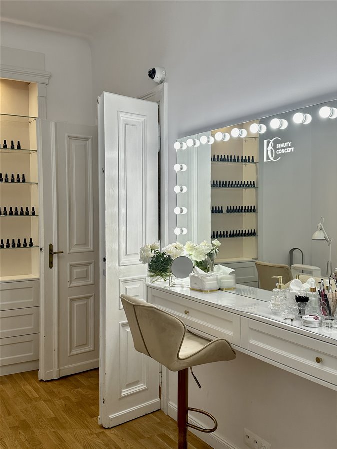 - 2 oddzielne gabinety z pełnym wyposażeniem (uniwersalne fotele kosmetyczne z możliwością dostosowania ich do każdego rodzaju usług, lampy, wbudowane pochłaniacze itd.).