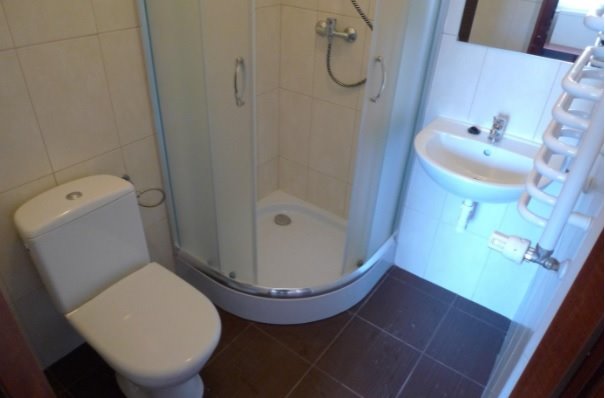 Każdy z pokoi wyposażony jest w dwa tapczany, instalację TV, łazienkę (kabina prysznicowa, umywalka, WC, grzejnik drabinkowy)