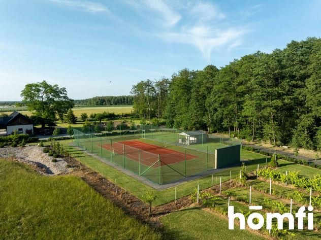 • kort tenisowy ze ścianką i domkiem na sprzęt sportowy