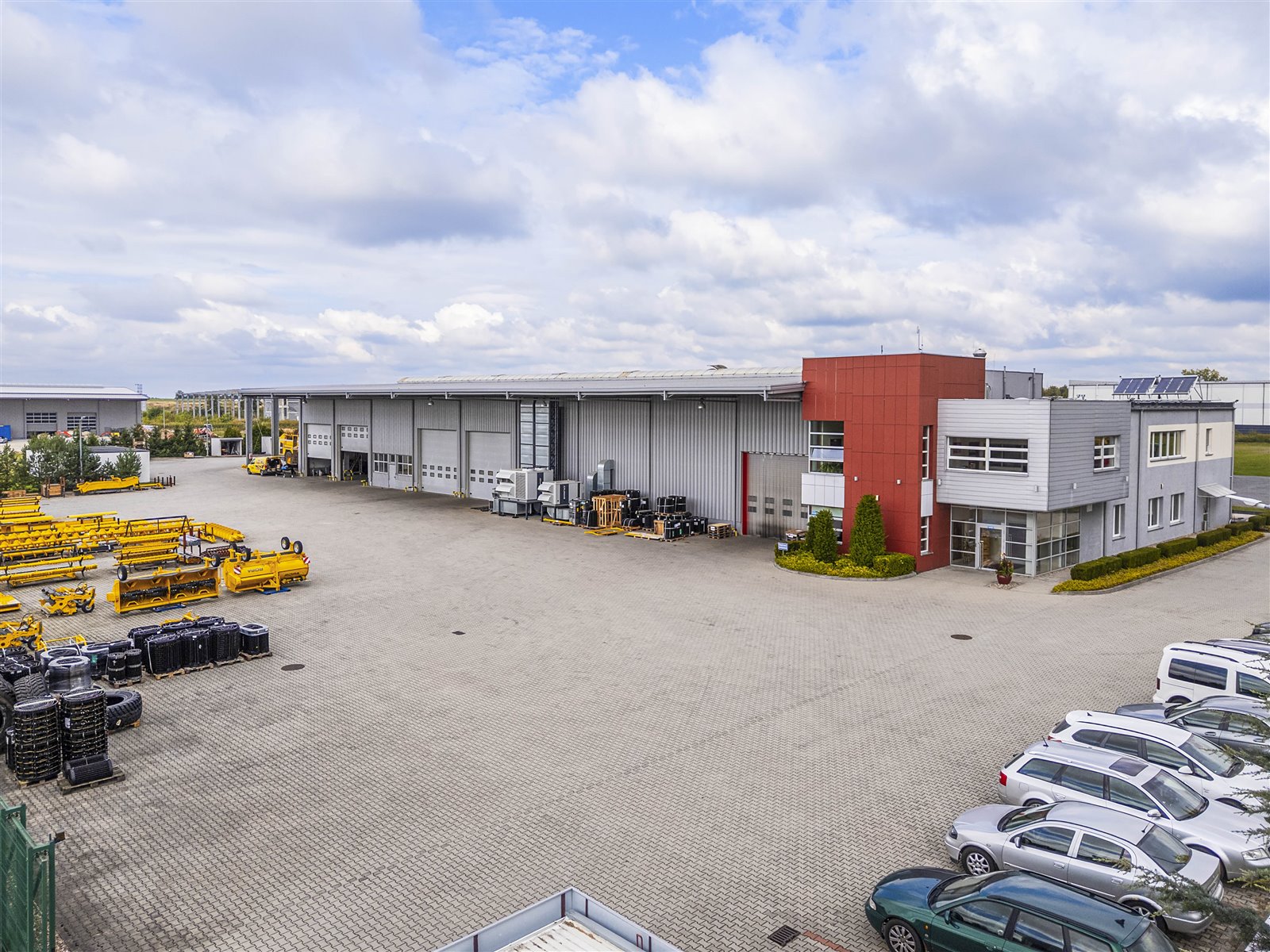 Teren wokół budynku został zagospodarowany jako plac manewrowo-składowy z miejscami postojowymi oraz dojazdami z kostki betonowej.