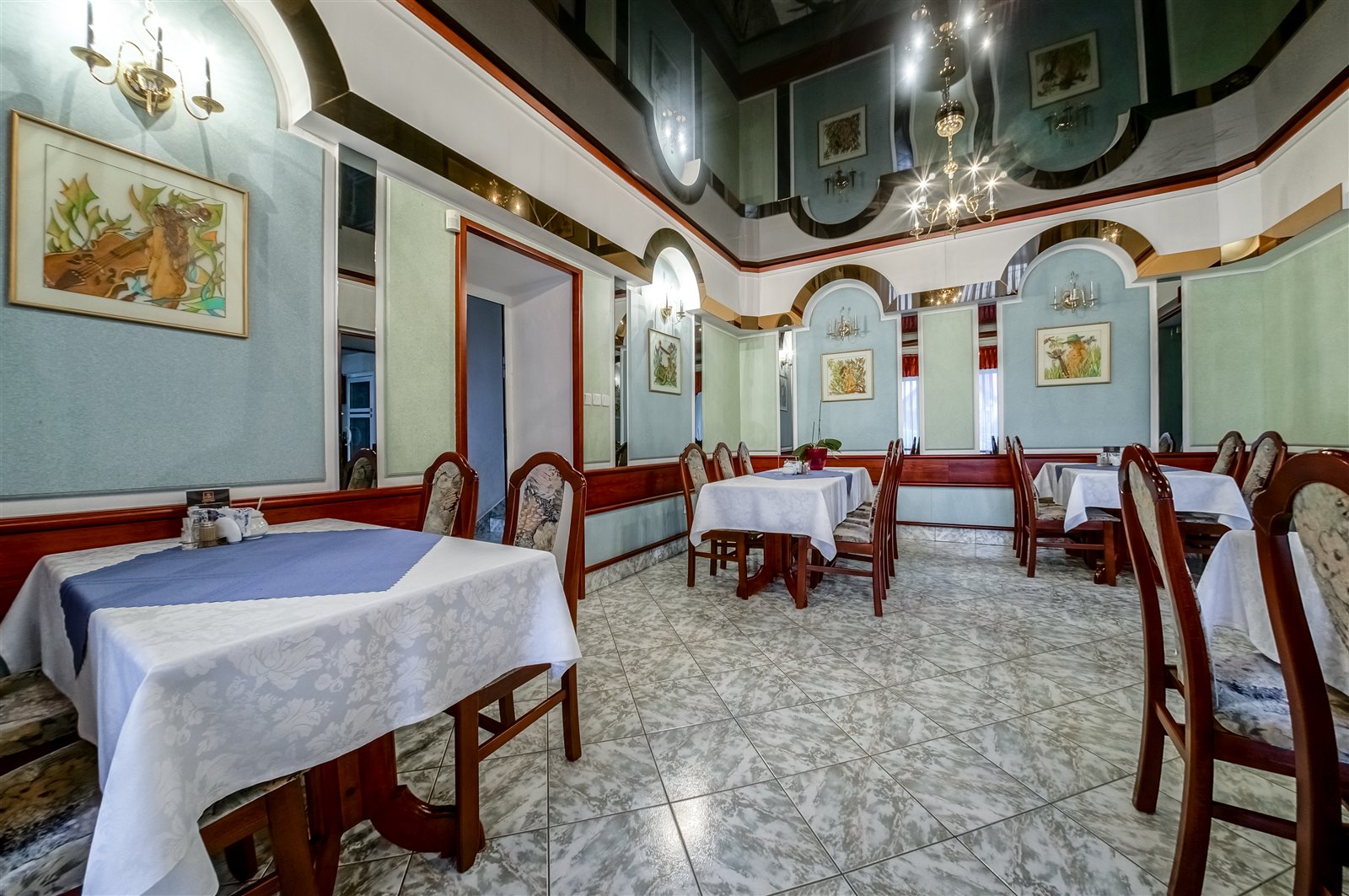 Hotel posiada wyjątkową restaurację ze szklanym sufitem, bar , kuchnią wraz z zapleczem kuchennym. W przyziemiu znajduje się również kotłownia, ciągi komunikacyjne, łazienki i szatnia dla pracowników.