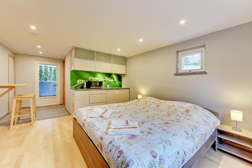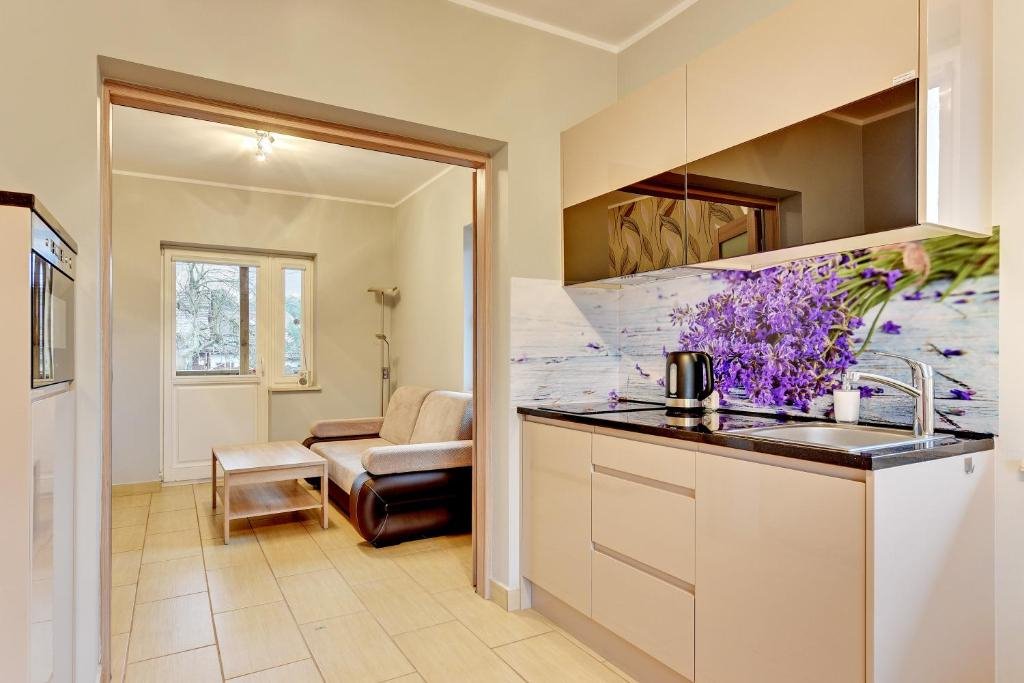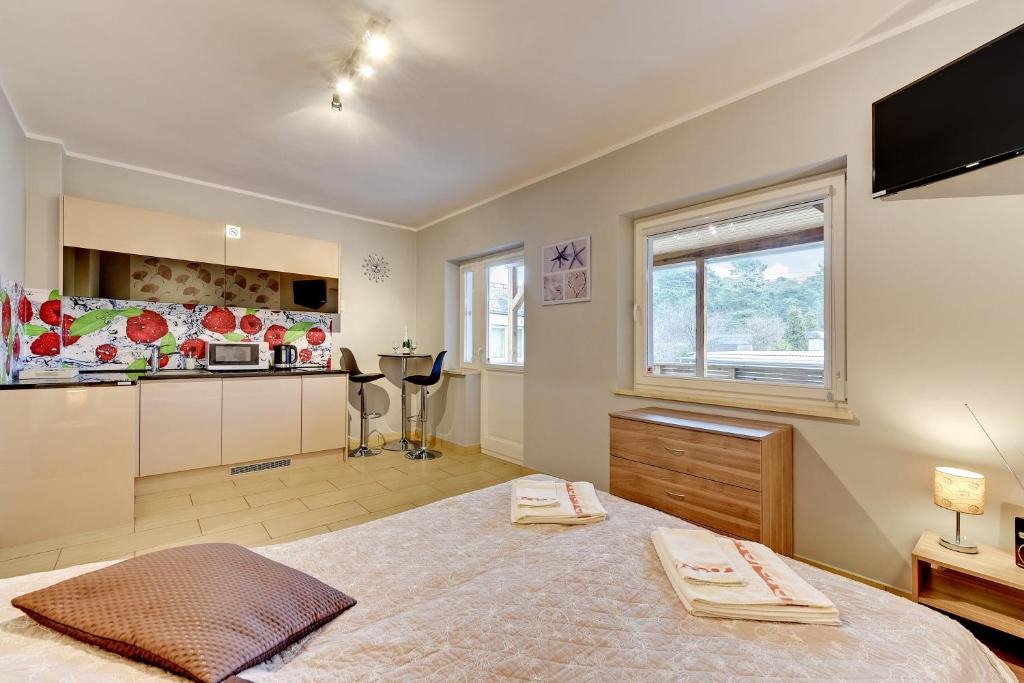 Każde studio posiada własne kuchnie i łazienki. Obiekt wykończony w 2016 r. przy użyciu wysokiej jakości materiałów (kamienie naturalne, ogrzewanie podłogowe, instalacja fotowoltaiczna, pompa ciepła w mieszkaniu właścicieli).