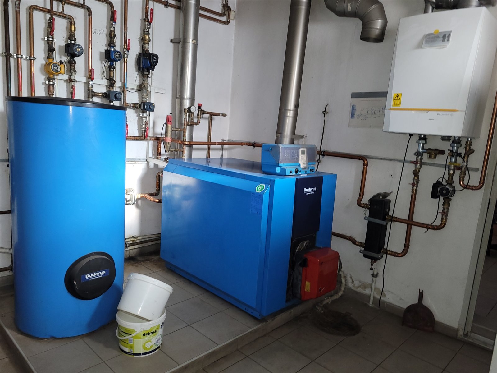 o część techniczną (kotłownia o pow. 35 m2 z kotłem na olej opałowy i możliwością podłączenia istniejącego kotła gazowego (konieczność wykonania podłączenia do sieci gazowej na dług. ok. 6m)