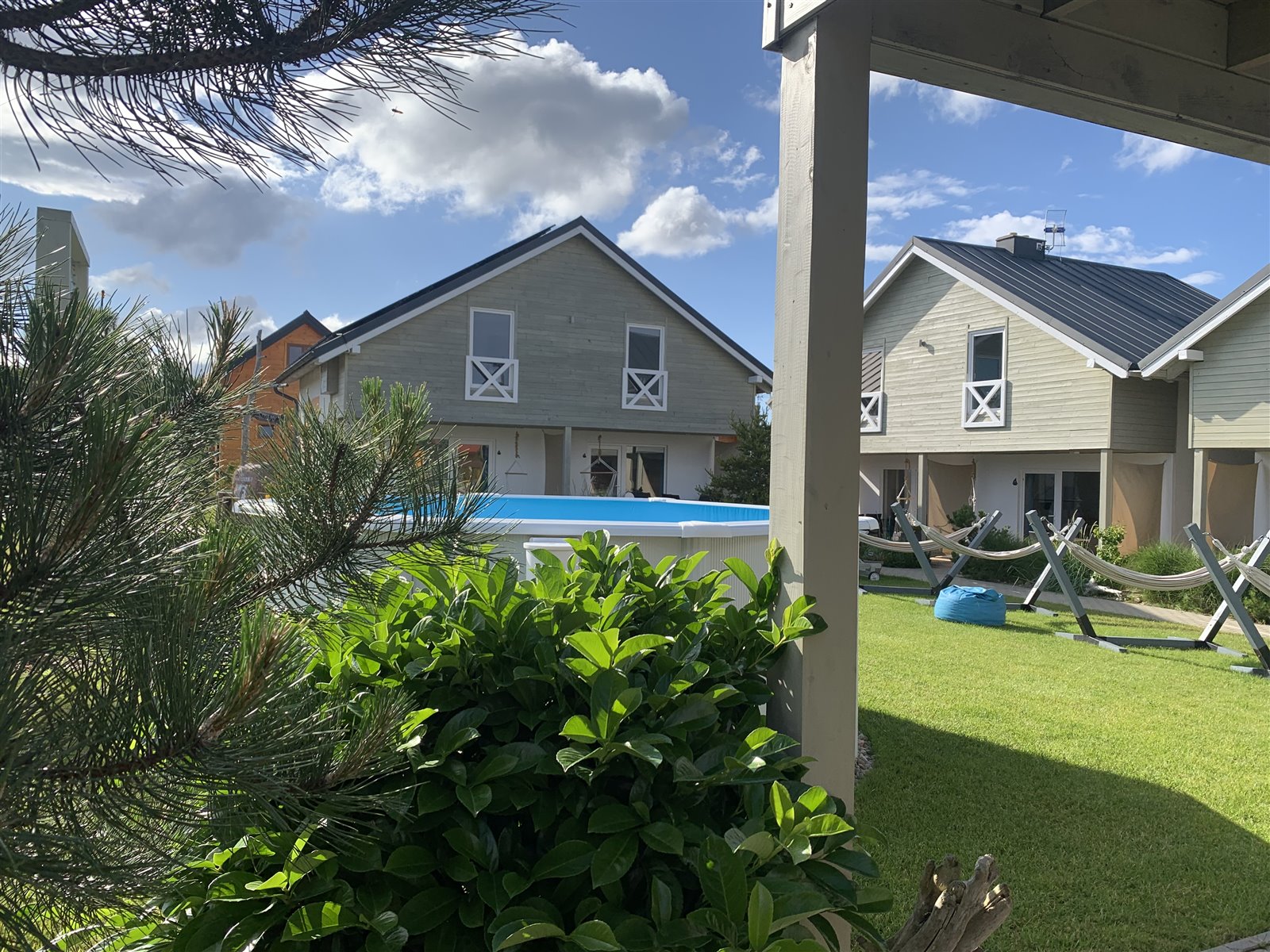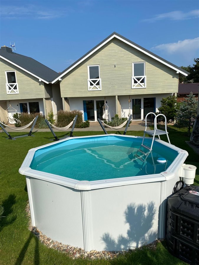 • Rekreacja: Na terenie ośrodka znajduje się nowoczesny basen o głębokości do 150 cm, który nie wymaga nadzoru ratownika, co czyni go idealnym miejscem do relaksu dla rodzin z dziećmi. Dodatkowo goście mają do dyspozycji duży plac zabaw, przestronną wiatę do biesiadowania z wygodnymi meblami i grillem oraz zadbaną przestrzeń rekreacyjną.