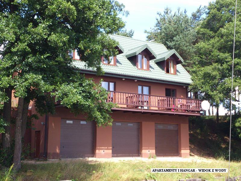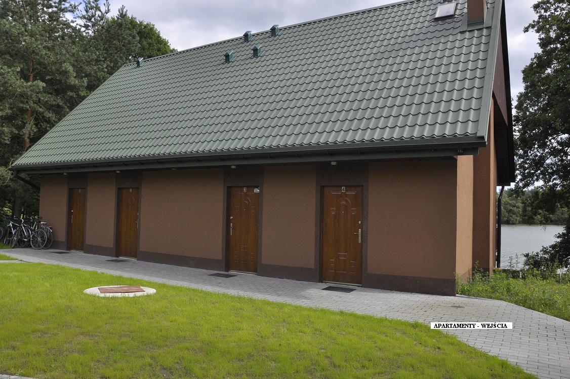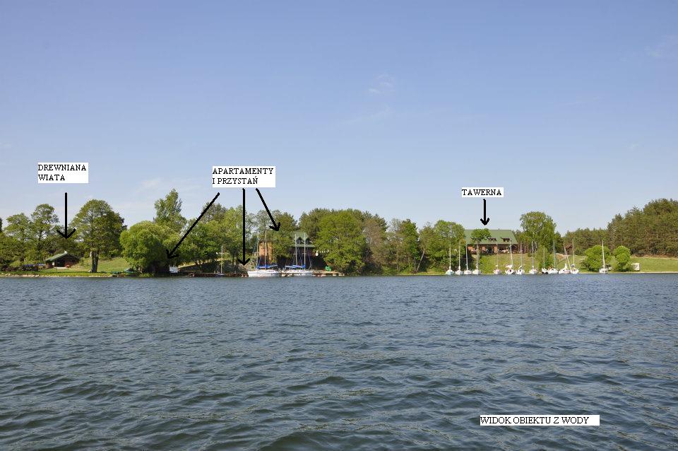 - budynek dwupoziomowych apartamentów, murowany, ocieplony, ogrzewany, wnętrza wykończone głównie w drewnie, apartamenty w pełni wyposażone, każdy o powierzchni ok. 40m², z balkonami nad samym jeziorem; dodatkowo w części przyziemia znajduje się zaplecze techniczne o pow. 100m² na sprzęt pływający z bramami wjazdowymi;