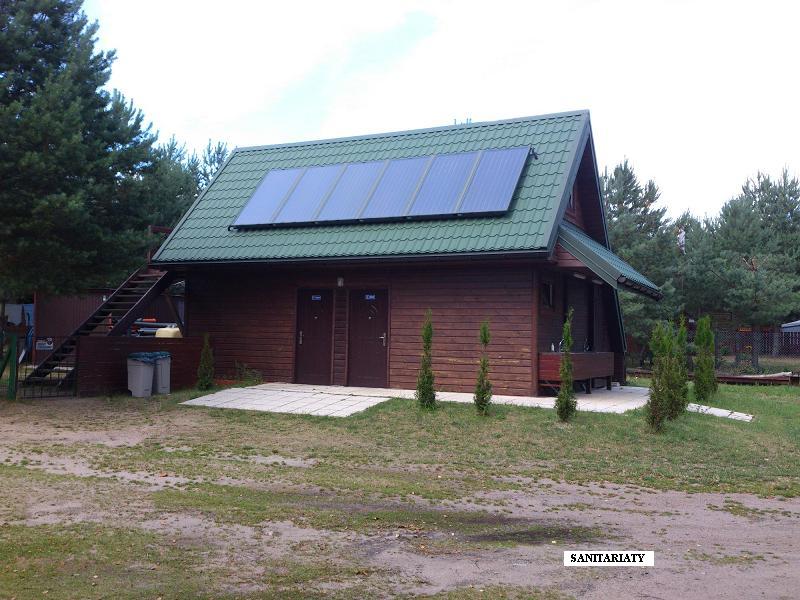 - dwupoziomowy budynek sanitarny, z systemem solarnym, pompą ciepła i zapleczem technicznym na poddaszu;