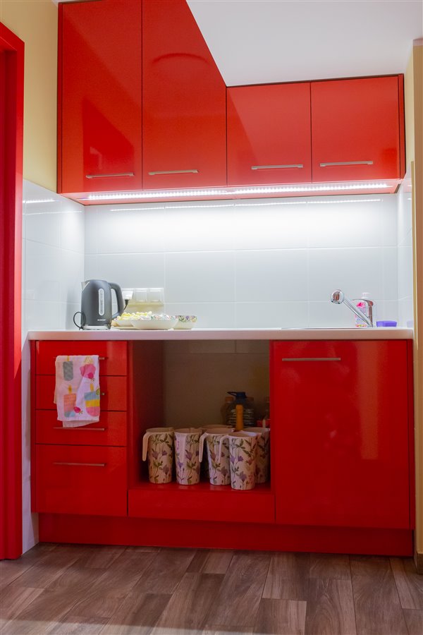 2. Zaplecze kuchenne z zabudową na wymiar - wyposażone m.in. w lodówkę z zamrażalnikiem, zmywarkę i mikrofalówkę.